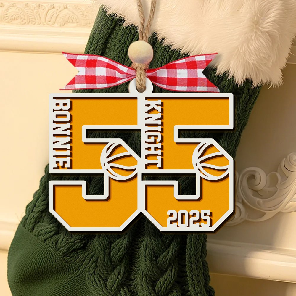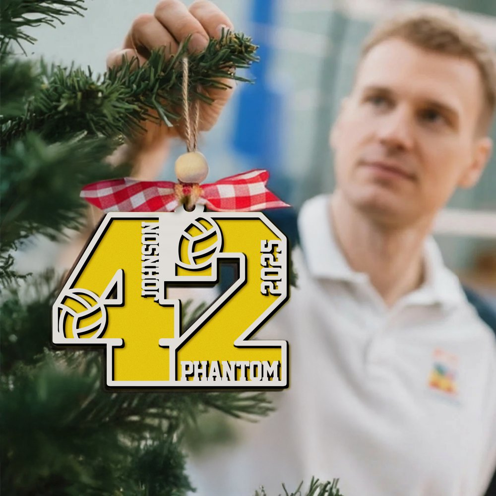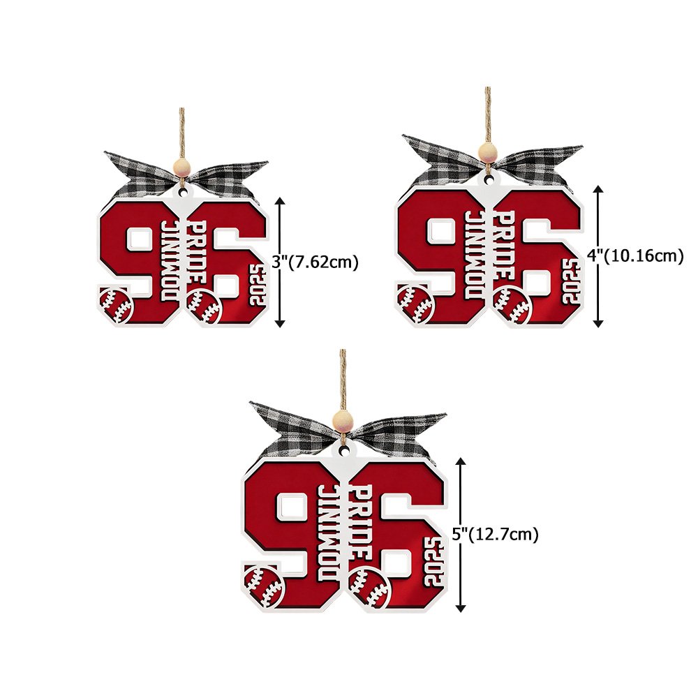 Cet ornement utilise des formes de chiffres et propose huit modèles de ballons de sport au choix : football américain, basket-ball, base-ball, football, volley-ball, pickleball, tennis et softball. Il peut être personnalisé en utilisant les couleurs de votre équipe préférée et les numéros des joueurs (00-99). Veuillez noter que le numéro doit être à deux chiffres. Vous pouvez également personnaliser le nom et choisir de personnaliser le nom de l'équipe et l'année, ce qui en fait une décoration artistique qui allie la passion du sport à l'esprit des fêtes.