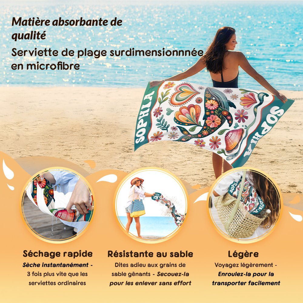 Vous pouvez créer une serviette de plage unique en choisissant une couleur de fond vibrante et en ajoutant un nom personnalisé. Le devant est orné d'une aquarelle fantaisiste représentant des créatures marines, transformant ainsi une serviette pratique en un hommage personnel qui célèbre l'amour de votre enfant pour l'océan et les aventures estivales.