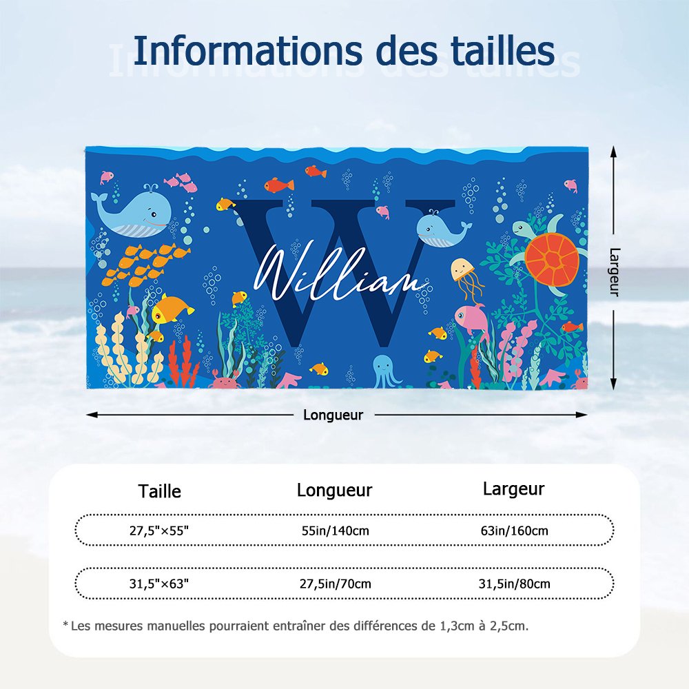 Imaginez le visage de votre enfant s'illuminer lorsqu'il voit ses initiales ou son nom. L'intégration au design du monde océanique en fait un trésor unique en son genre. Cette personnalisation ajoute un élément spécial et sincère qui fait de cette serviette un souvenir.
