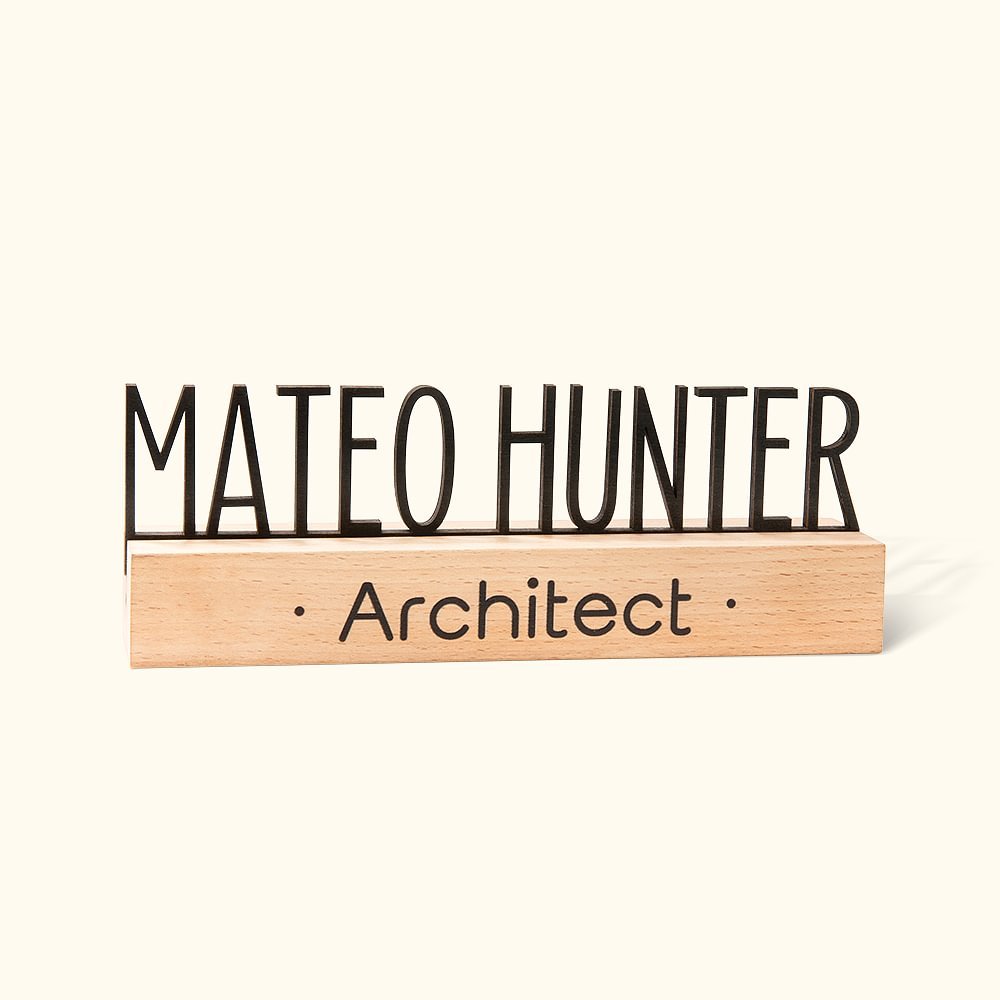 Il s'agit d'une combinaison de plaque signalétique en contreplaqué et de support en hêtre. La plaque signalétique noire est encastrée dans la longue base en bois de hêtre, ce qui la rend à la fois simple et délicate.