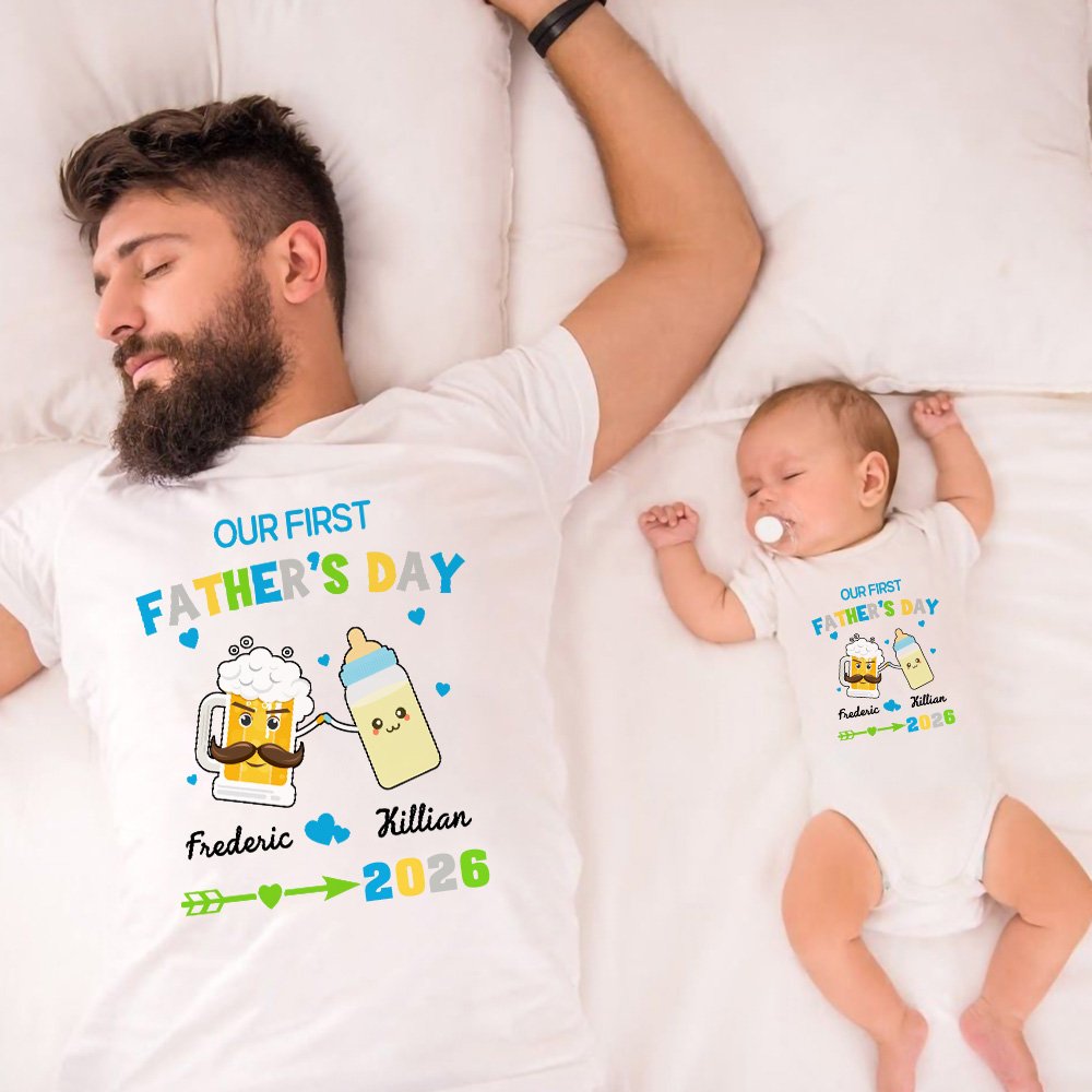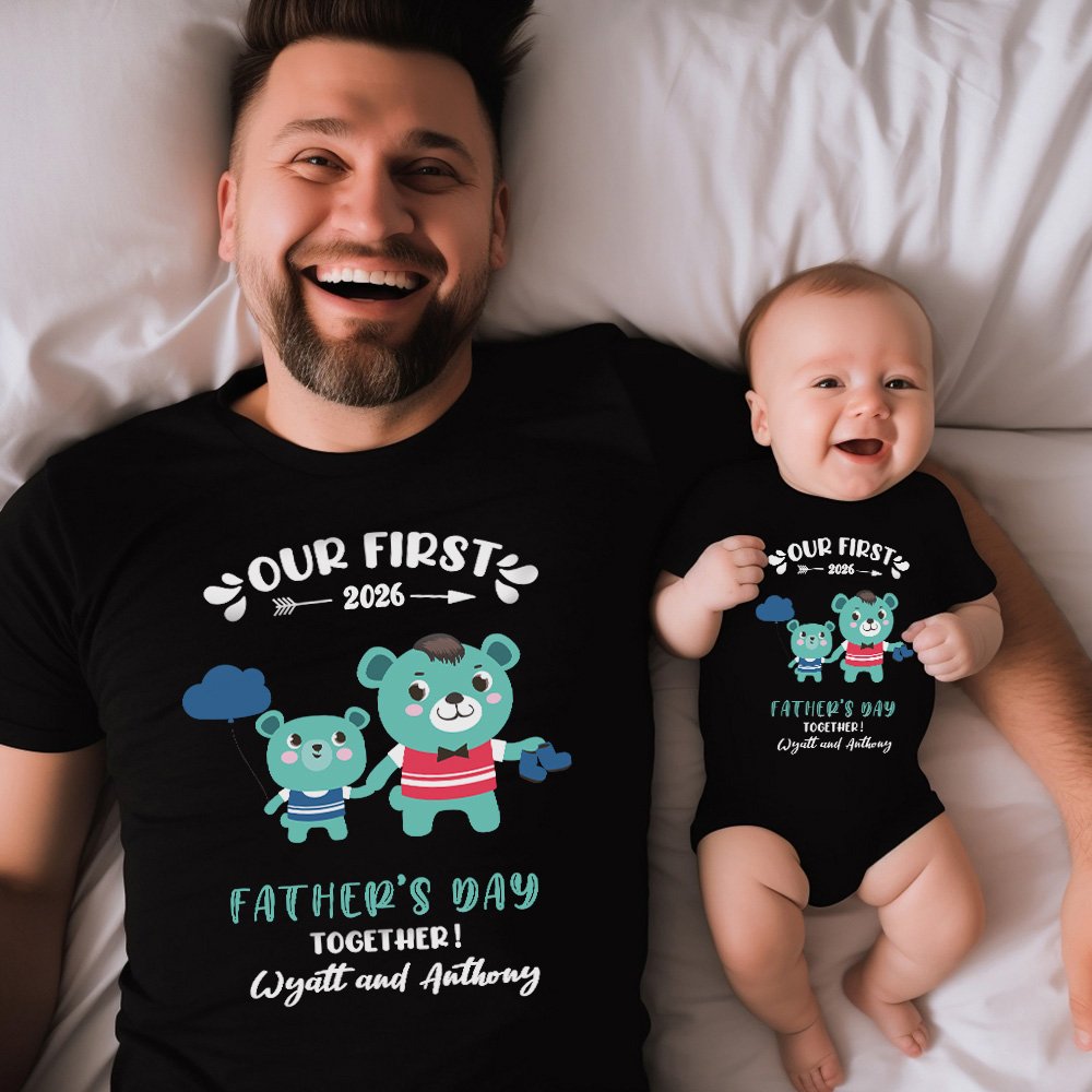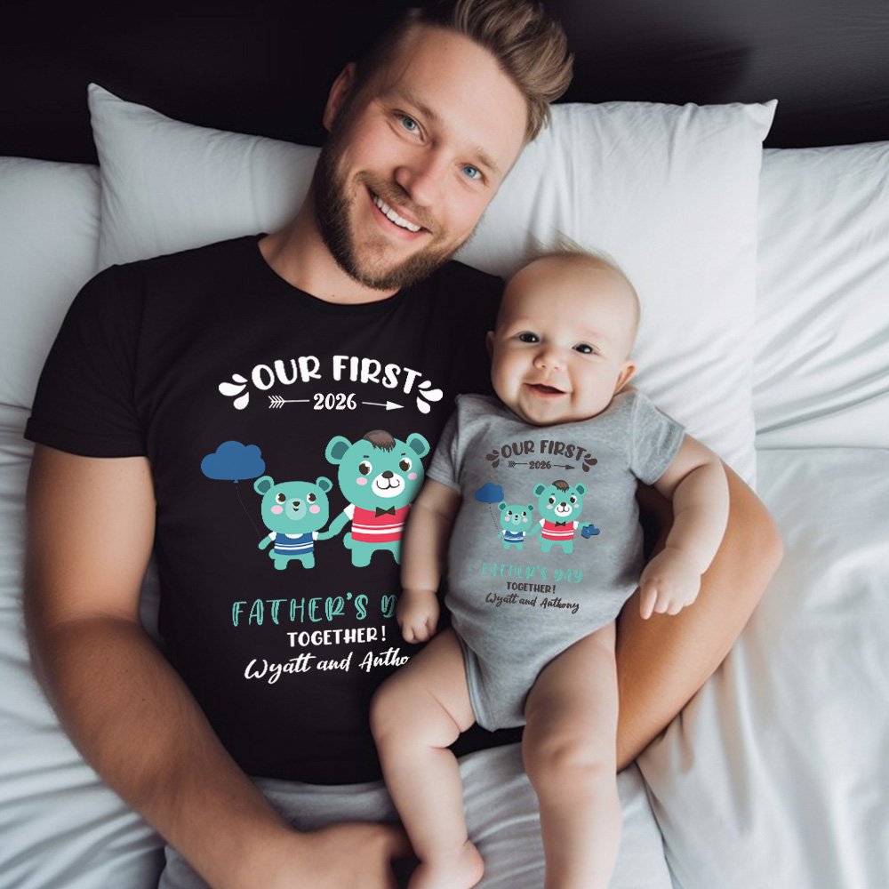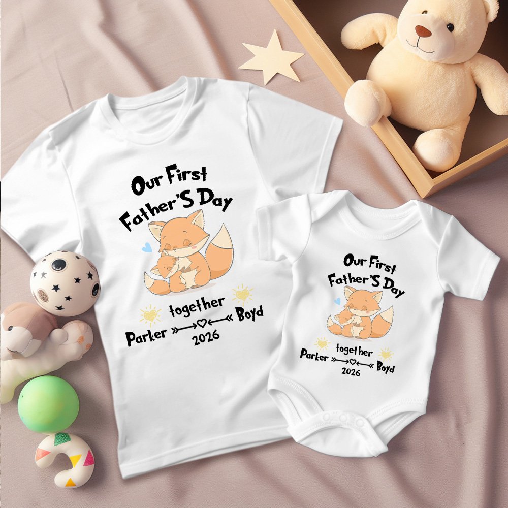 Cet ensemble T-shirt pour papa et grenouillère pour bébé est une façon amusante et tendance de célébrer la première fête des pères d'un nouveau papa. Doté d'un motif adorable et du texte "Our First Father's Day together", il capture la joie et l'amour entre le papa et le bébé.