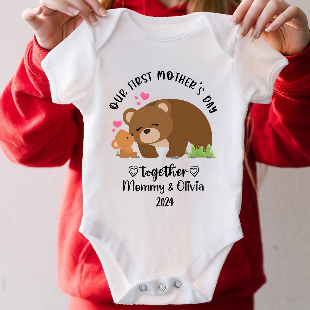 Notre ensemble pour bébé et mère comprend 4 adorables animaux, éléphant, ours brun, girafe et koala, et la chaleureuse citation "Notre première fête des mères ensemble", symbolisant la relation inséparable entre la mère et l'enfant, et montrant un moment chaleureux entre parents et enfants. Vous pouvez également personnaliser les noms pour le rendre unique.