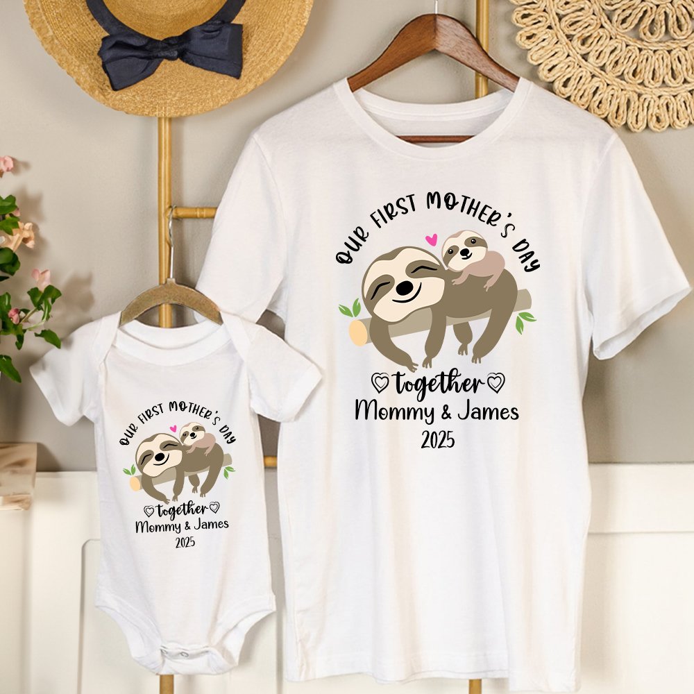 Notre T-shirt présente 4 adorables animaux, l'éléphant, l'ours brun, la girafe et le koala, ainsi que la chaleureuse citation "Notre première fête des mères ensemble", qui symbolise la relation inséparable entre la mère et l'enfant, et témoigne d'un moment chaleureux entre parents et enfants. Vous pouvez également personnaliser les noms pour rendre ce T-shirt unique.
