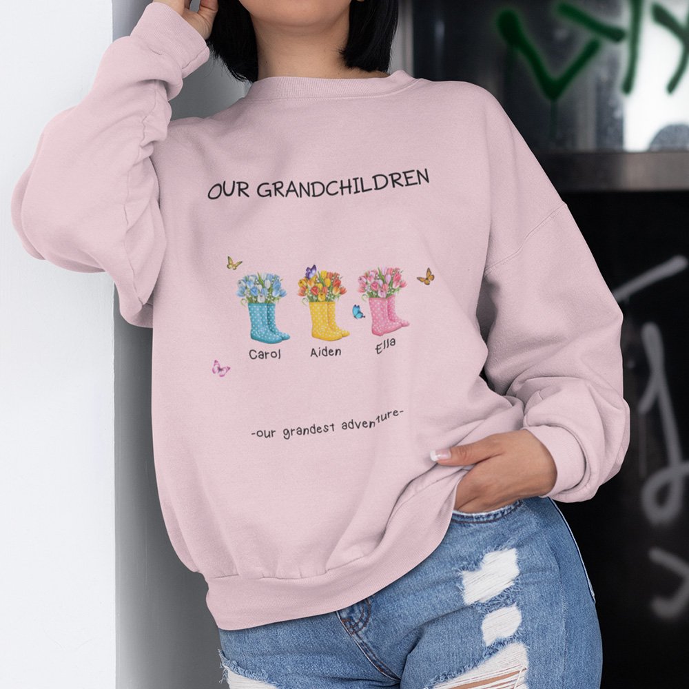 Ce sweat-shirt personnalisé présente un joli motif de bottes de jardin sur le devant, symbolisant la compagnie et l'attention des enfants. Il met en valeur la chaleur et l'affection uniques de la famille. Le modèle peut être personnalisé avec 1 à 6 noms, chacun représentant les membres de la famille les plus chers au cœur d'une mère, offrant ainsi une profonde expression d'amour.