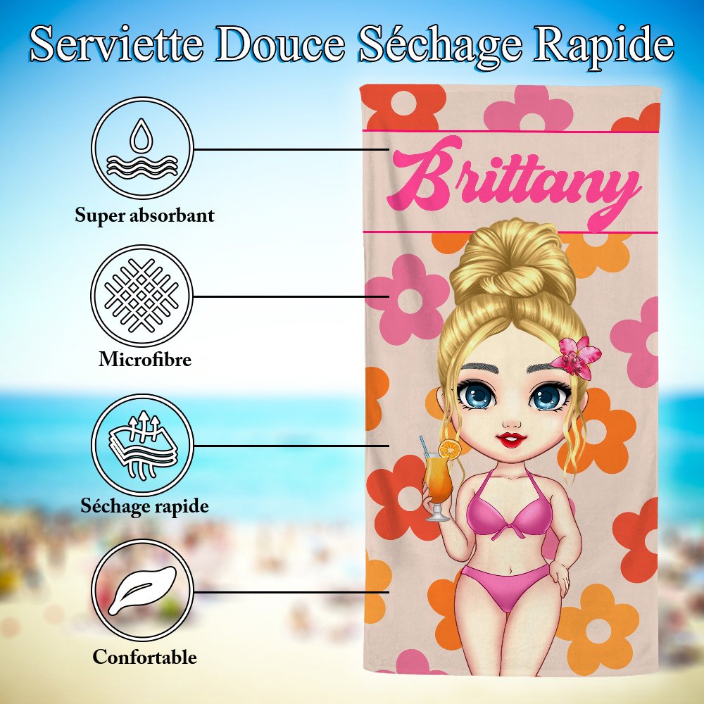 Rendez votre expérience de la plage vraiment spéciale avec nos serviettes de plage personnalisables représentant un charmant personnage de dessin animé et des motifs floraux. Vous pouvez ajouter votre nom au motif, pour que votre serviette personnalisée se distingue à la plage ou au bord de la piscine.