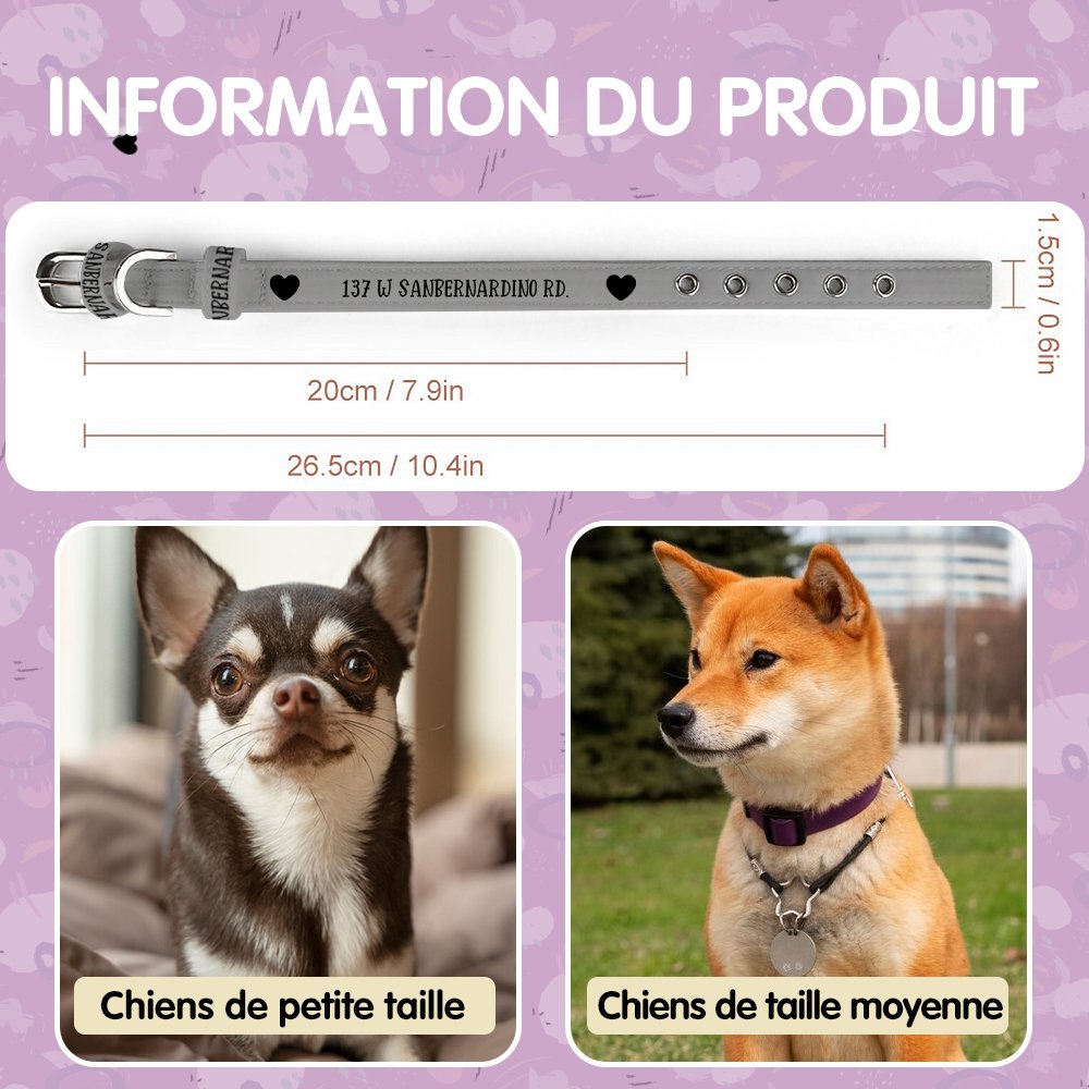 Ce collier personnalisé pour animaux de compagnie est conçu avec amour et soin pour que votre compagnon à quatre pattes se distingue. Avec neuf couleurs vibrantes et trois motifs adorables au choix, vous pouvez trouver le collier parfait pour convenir au style unique de votre animal. C'est un accessoire à la mode qui met en valeur la personnalité de votre animal et lui permet de se distinguer lors de ses promenades ou de ses séances de jeu.
