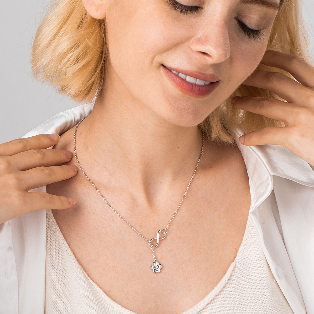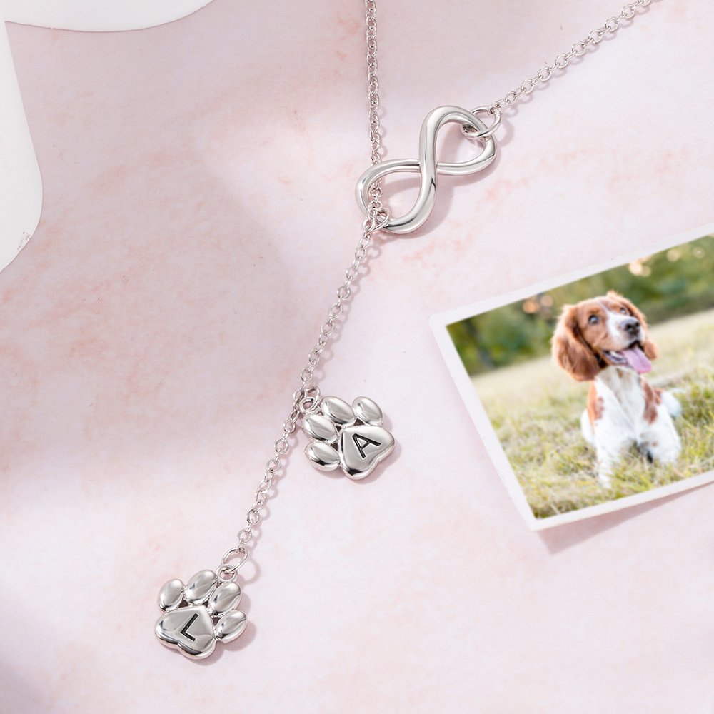 Ce collier peut être personnalisé avec les initiales de l'animal sur l'empreinte de patte et associé au symbole de l'infini, exprimant l'amour sans fin pour les animaux de compagnie qui ne s'arrêtera pas avec le départ de la vie.