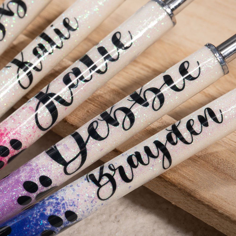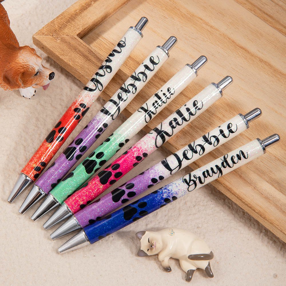 Nos stylos mignons sont scintillants et brillants et portent l'empreinte d'une patte, ce qui en fait un cadeau idéal pour tous ceux qui aiment un peu d'éclat ! Vous pouvez personnaliser votre nom ou n'importe quel texte pour en faire un cadeau unique et attentionné pour les amoureux et les propriétaires d'animaux.