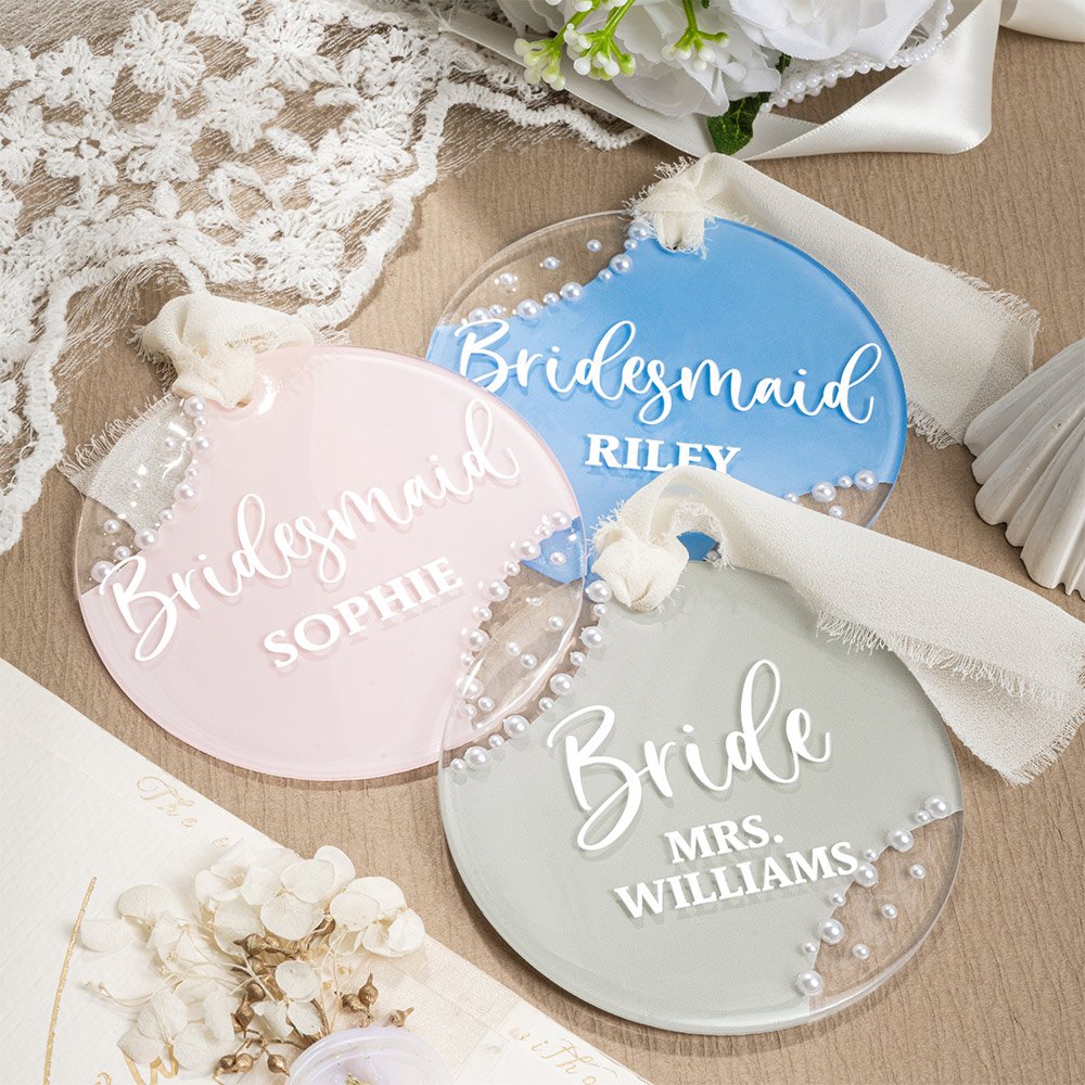 L'étiquette de suspension est ornée de détails perlés exquis et est conçue de manière unique pour refléter vos préférences, y compris les noms et les titres. Cette touche personnalisée ajoute de l'élégance à n'importe quel mariage ou enterrement de vie de jeune fille, faisant de chaque étiquette une pièce remarquable qui complète magnifiquement la célébration.
