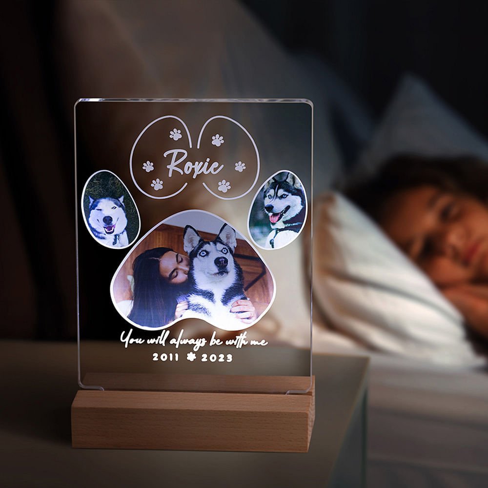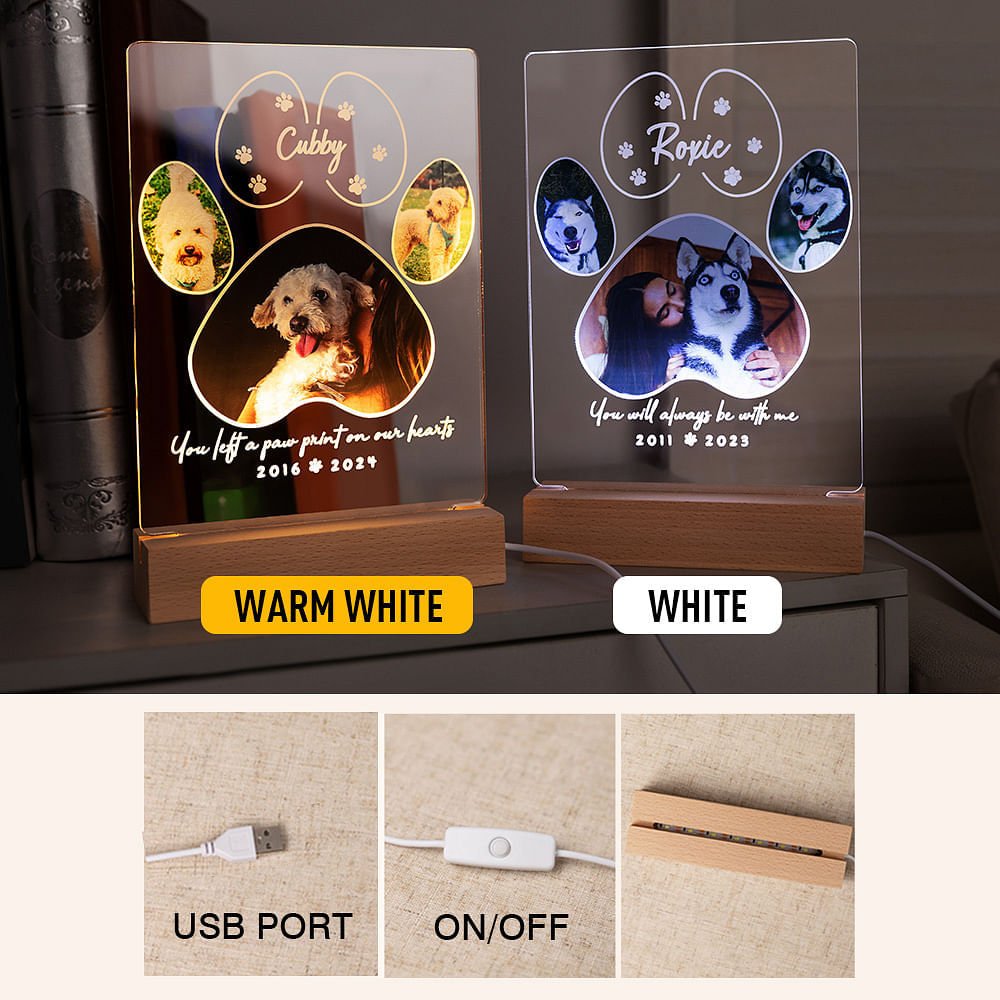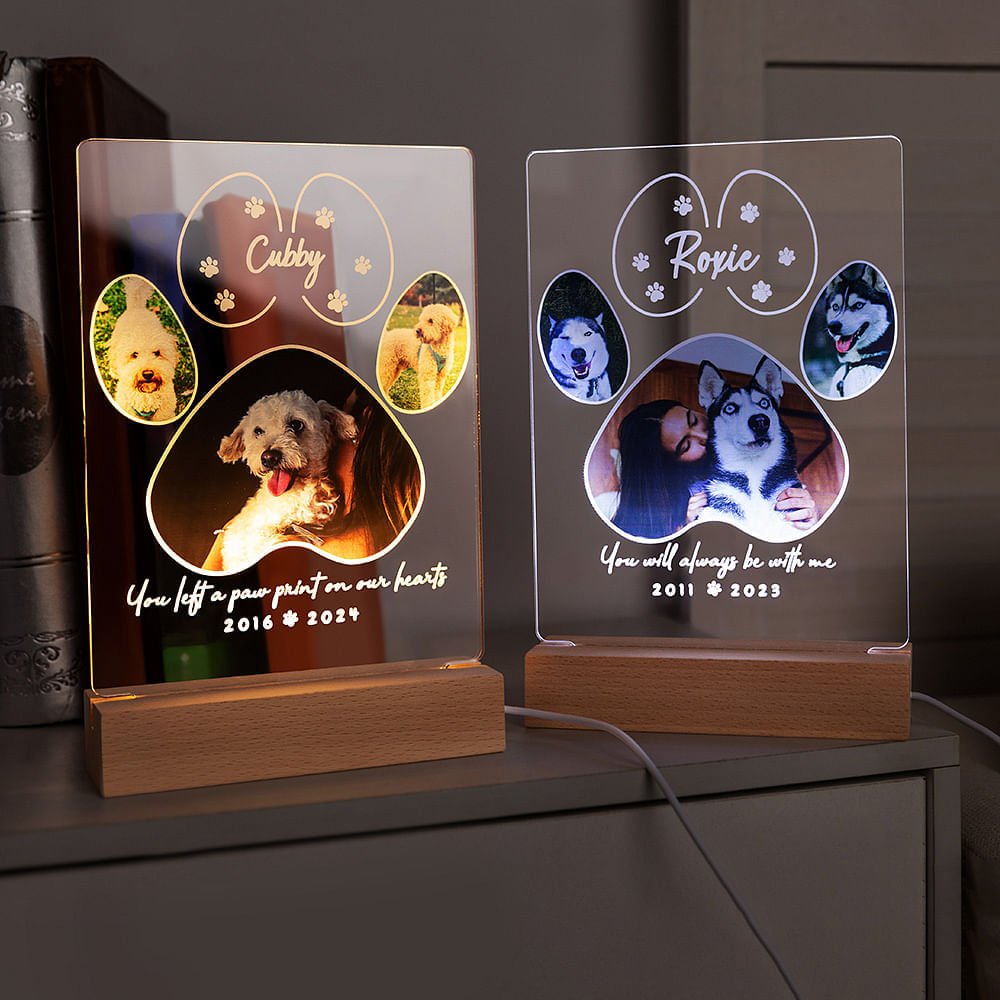 This personalized paw print night light can be used as a pet memorial plaque, a sentimental night light, or a framed photo display. It can also be positioned on a tabletop, shelf, or nightstand to create a touching tribute.