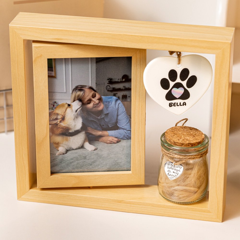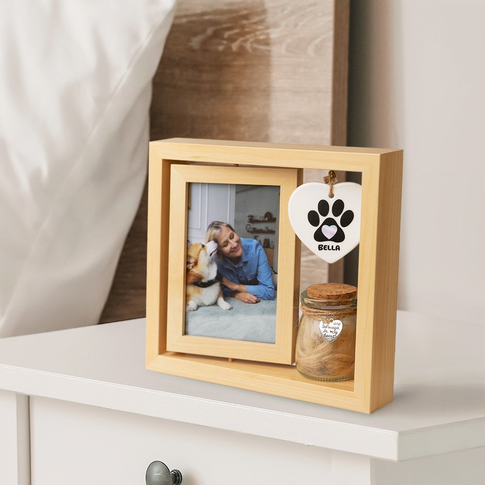 Ce magnifique cadre photo en bois est un hommage sincère à votre animal de compagnie bien-aimé. Il comporte un ornement en forme de cœur en céramique avec un nom personnalisé et un pot commémoratif pour la fourrure ou les cendres de votre animal. Il affiche deux photos chères et peut pivoter à 360°, ce qui en fait un moyen spécial de se souvenir de votre ami à fourrure.