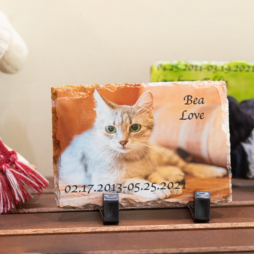 Vous pouvez personnaliser le nom de votre animal, sa date de naissance et de décès, ainsi que le message du propriétaire. Disponible en 3 tailles, le support noir est un accessoire fourni avec le produit. Vos chats et chiens préférés, ainsi que les chevaux, tant qu'ils sont des animaux de compagnie, peuvent être personnalisés. Vous pouvez également personnaliser les photos que vous souhaitez commémorer.