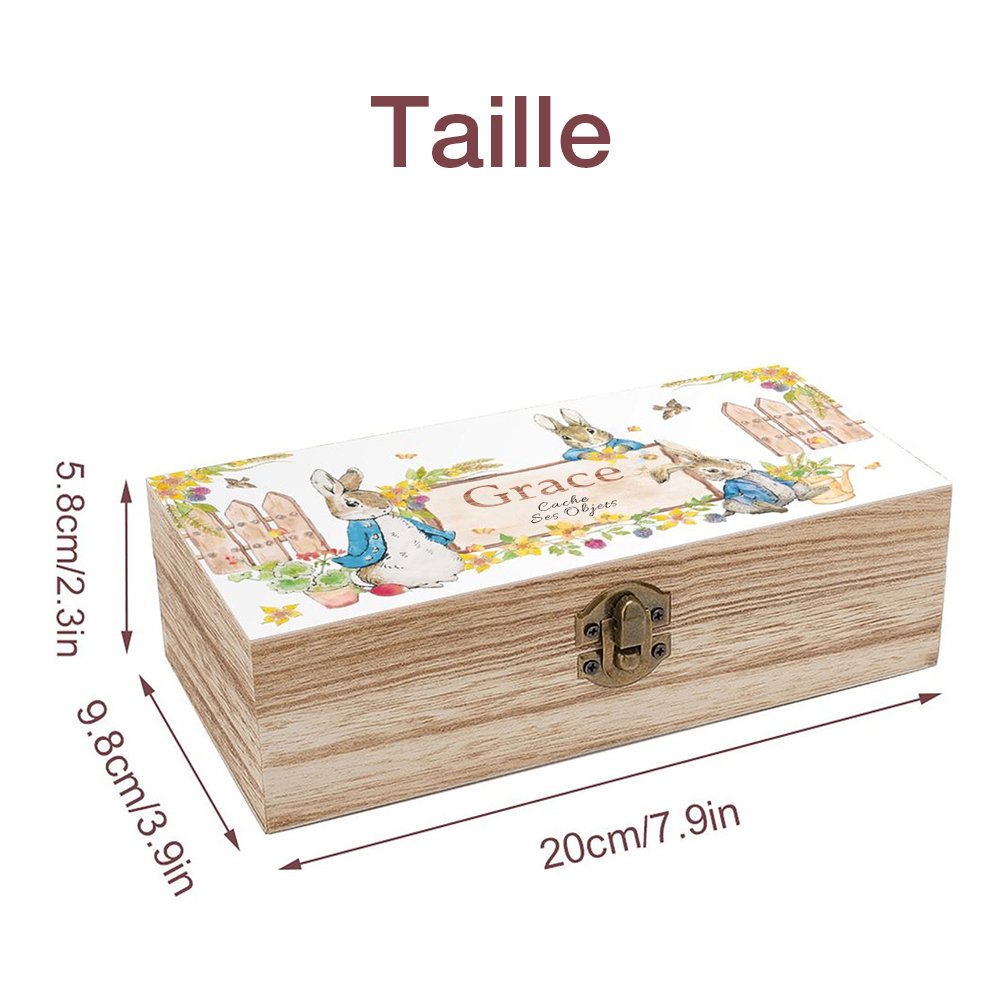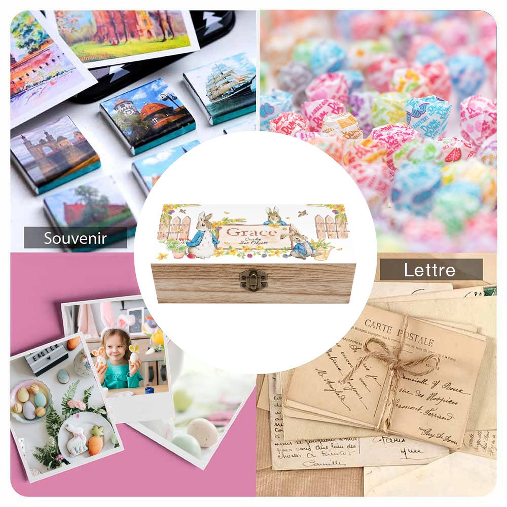 Cette boîte de rangement en bois est ornée d'un adorable motif de lapin de Peter, de 3 adorables lapins avec de jolies fleurs, et vous pouvez personnaliser le nom et le texte sur cette boîte pour la rendre spéciale.