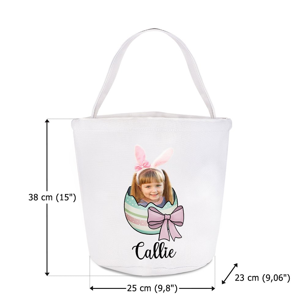 Ce panier de Pâques combine des éléments festifs avec une touche personnelle. Téléchargez une photo de votre enfant et nous l'incorporerons au motif de l'œuf coloré à l'intérieur du panier, représentant un enfant sortant d'un œuf pour ajouter à l'atmosphère festive. Vous pouvez également personnaliser le panier avec le nom de votre enfant, ce qui en fait un cadeau unique et spécial.