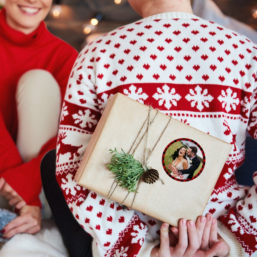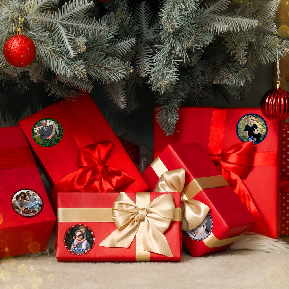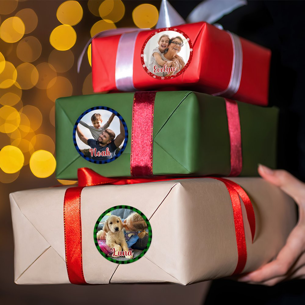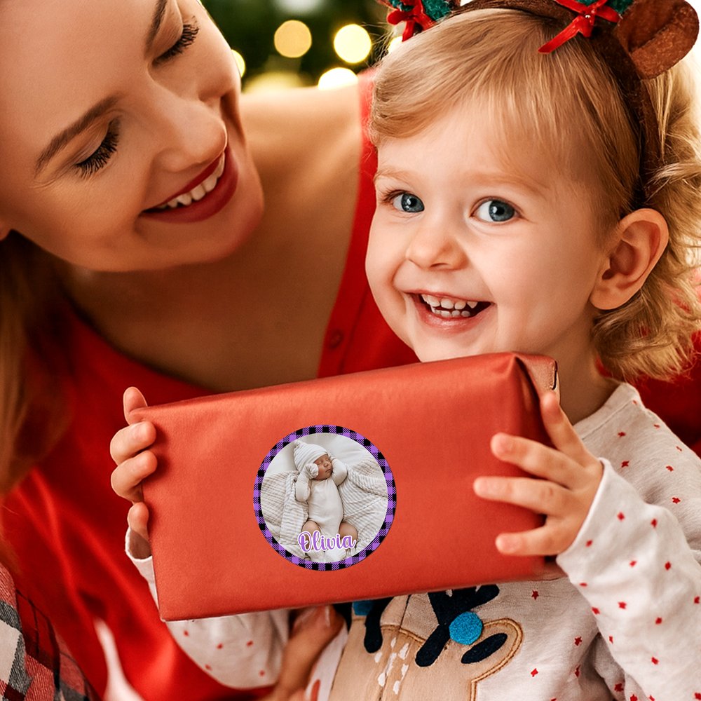 Cet autocollant incorpore des éléments classiques de Noël tels que des écossais et des flocons de neige, incarnant ainsi le charme traditionnel de la fête. La personnalisation avec une photo et un nom transforme un cadeau ordinaire en un souvenir inoubliable.