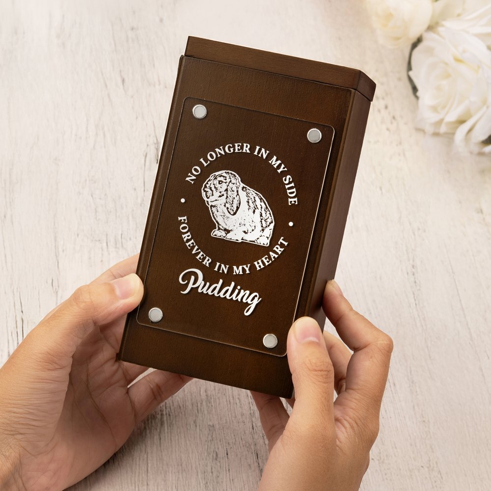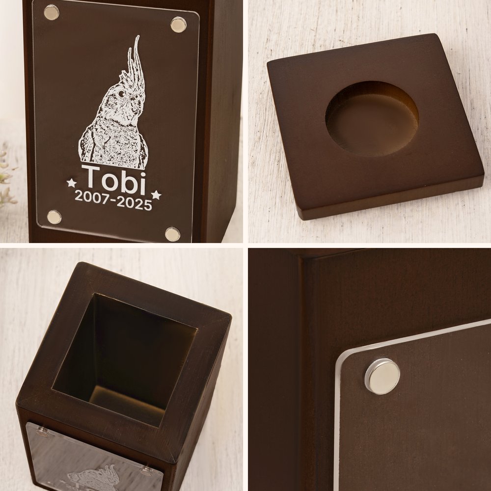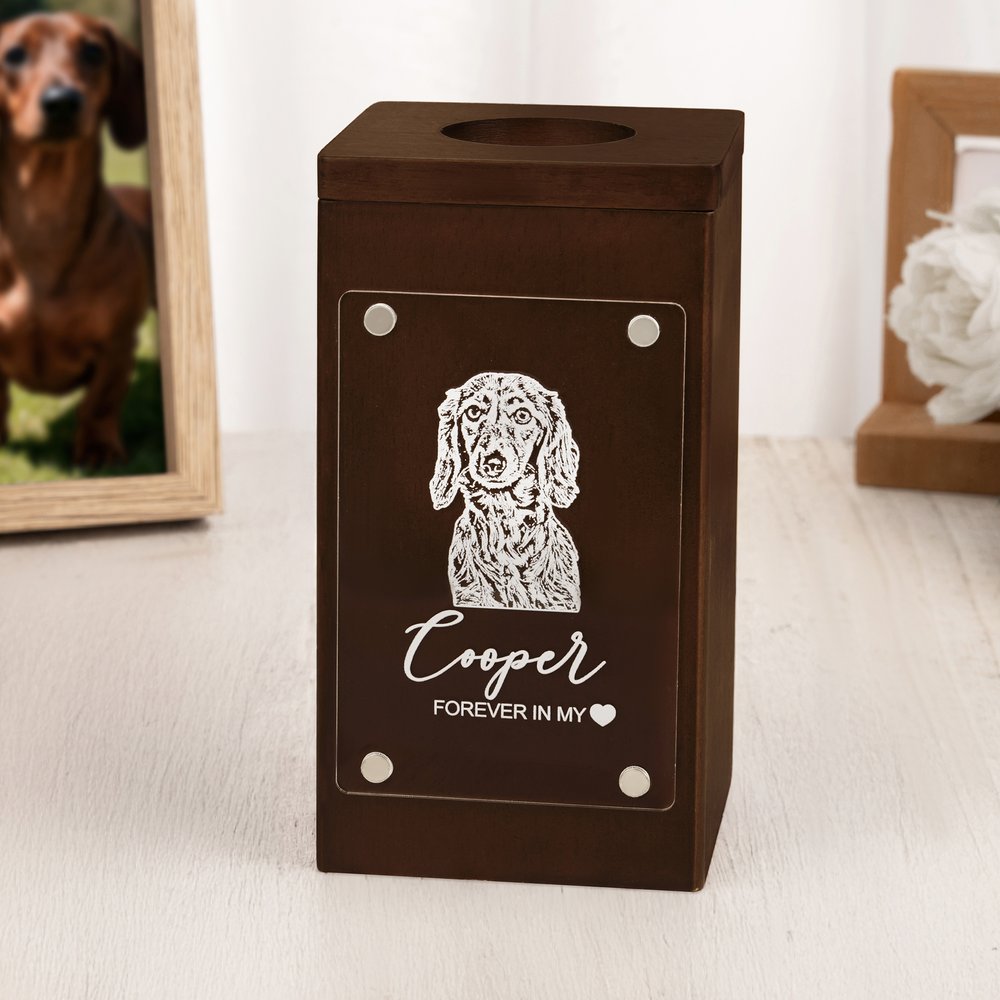 Fabriquée en hêtre de haute qualité et dotée d'un couvercle en acrylique fixé par un aimant, l'urne est robuste, durable et respectueuse des souvenirs. Le bois verni résiste à l'usure, tandis que l'acrylique assure une visibilité claire et durable des détails gravés sur votre animal, équilibrant la durabilité avec une sensation tactile chaleureuse.