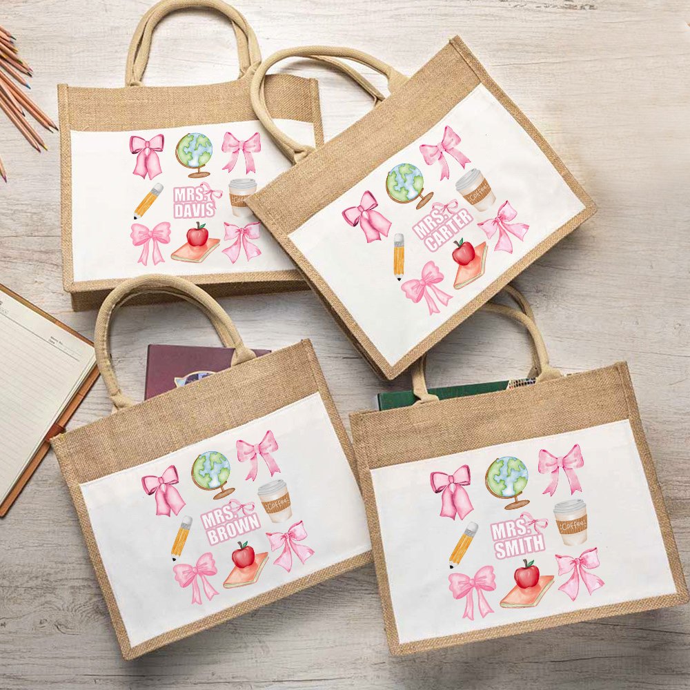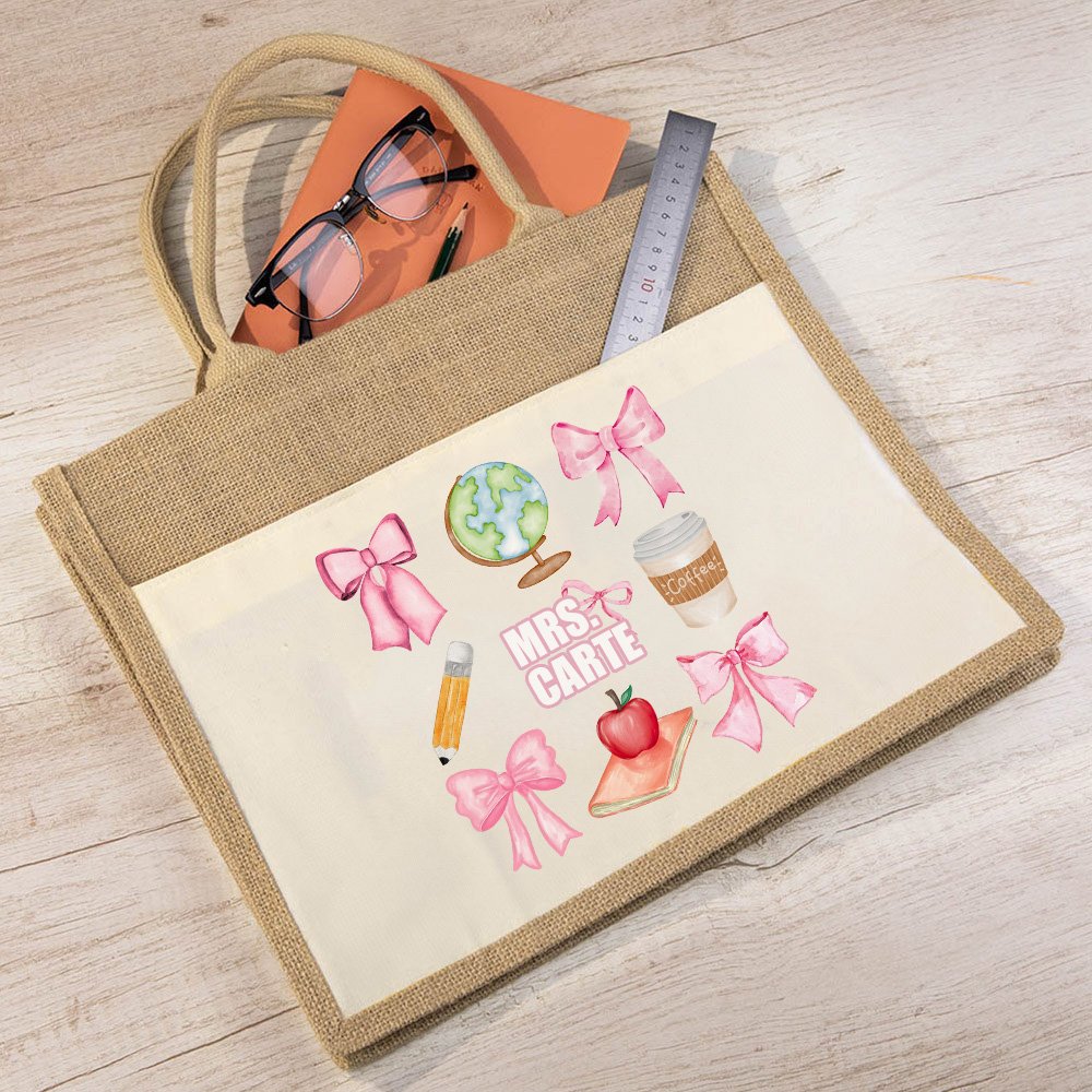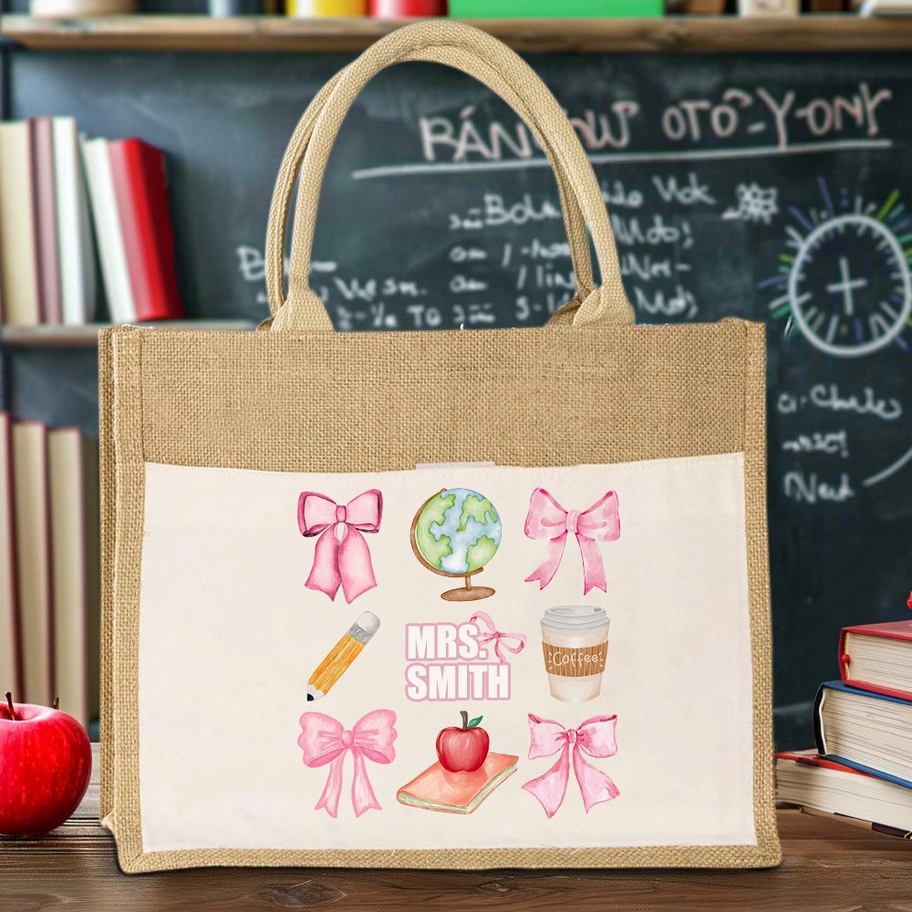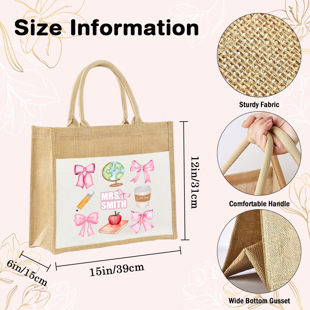Ce sac fourre-tout en toile de jute présente des motifs classiques tels qu'un nœud rose, un crayon, un café, un globe et une pomme. Ces éléments représentent magnifiquement le rôle nourricier et éducatif des enseignants, ce qui en fait un cadeau idéal pour exprimer sa gratitude.