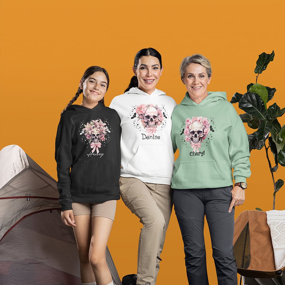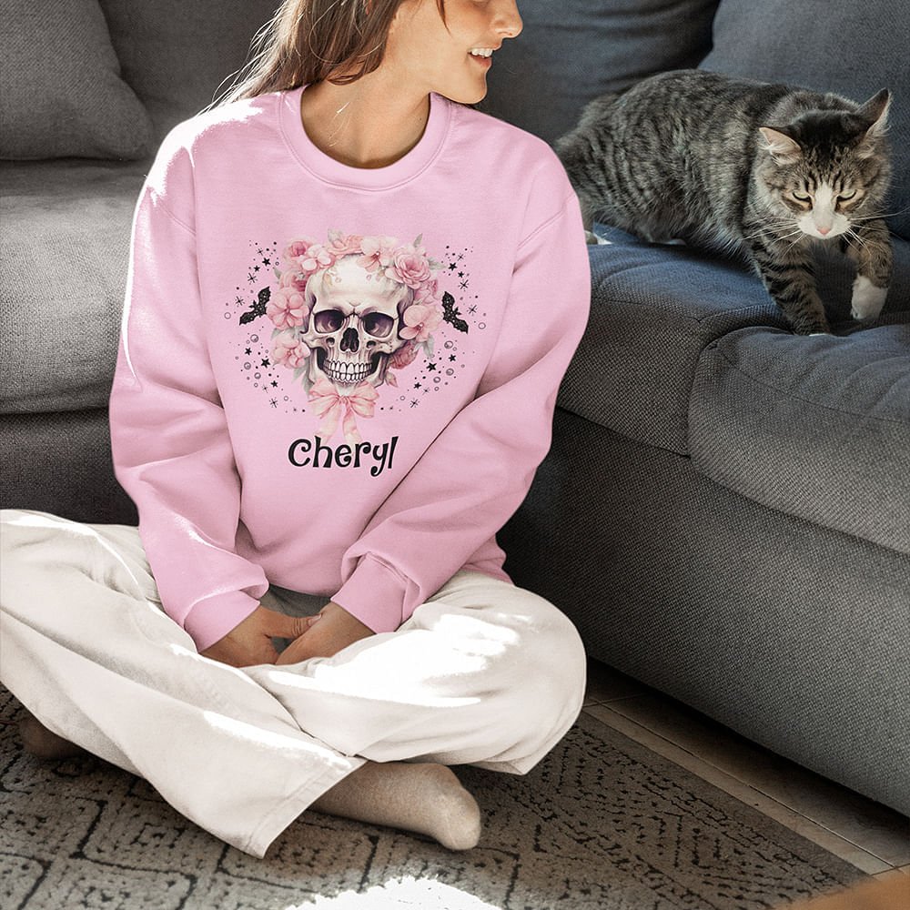 Ce sweat-shirt ou sweat à capuche rose personnalisé avec fleur de tête de mort utilise un service personnalisé pour donner vie à votre nom sur les vêtements, avec une tête de mort et un magnifique motif de fleur rose qui est mystérieux et doux.