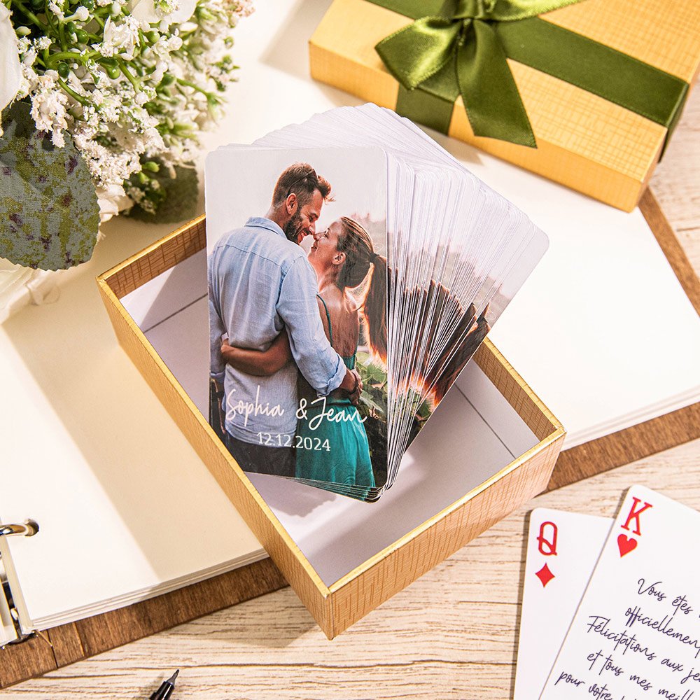 Ces cartes à jouer personnalisées sont une alternative unique au livre d'or de mariage. Vous pouvez avoir votre photo sur la couverture arrière, les côtés avant seront vierges avec des symboles de cartes à jouer sur les coins, de sorte que les invités peuvent écrire leurs souhaits sur les cartes. Après avoir écrit sur les cartes, vous pouvez les ranger séparément, mais ne les empilez pas immédiatement pour éviter les bavures. Les marqueurs à base d'huile sèchent généralement en quelques secondes.