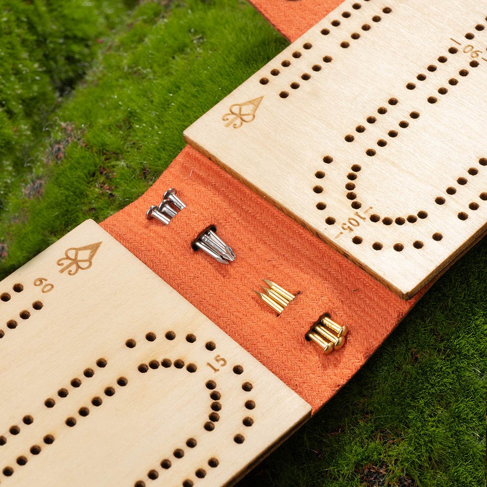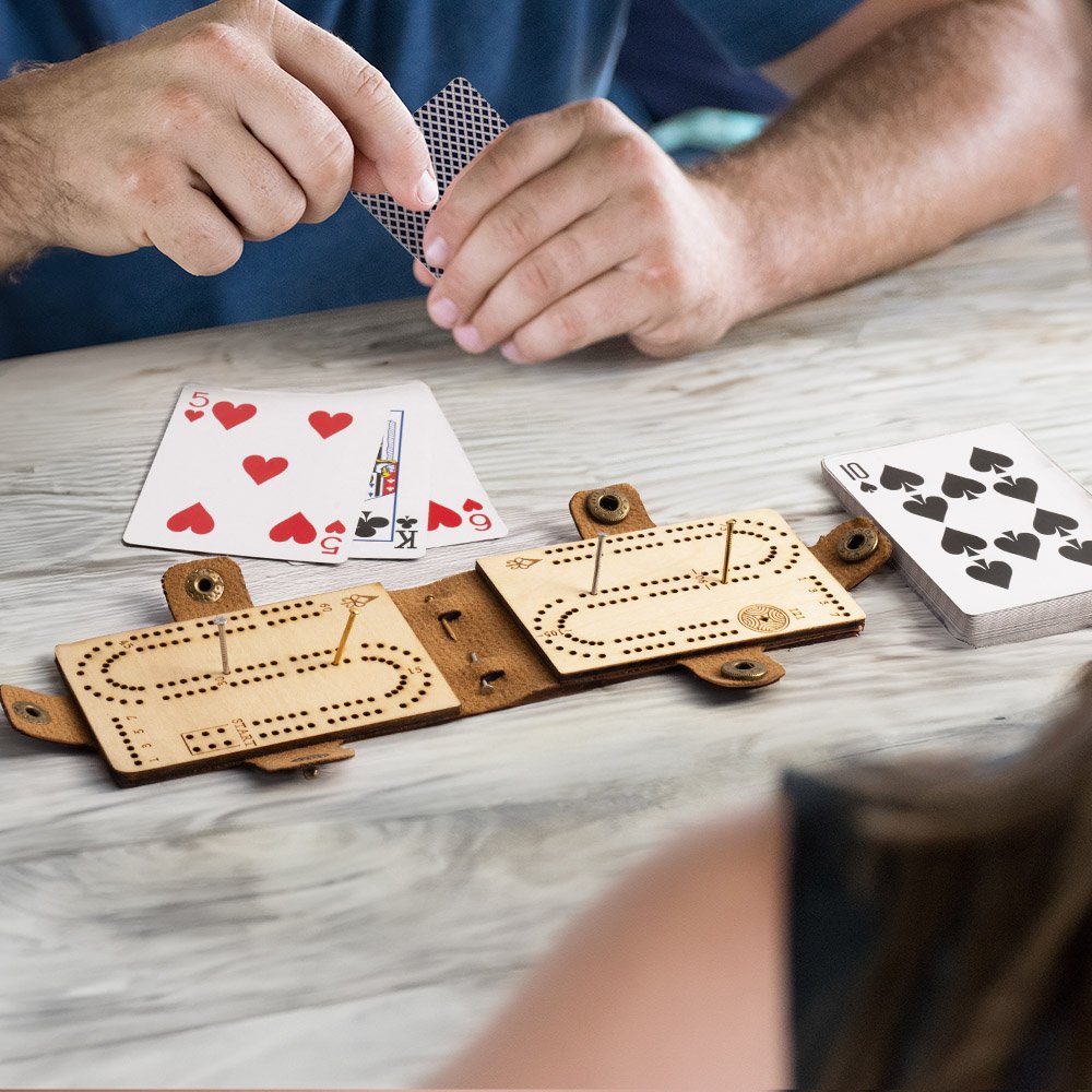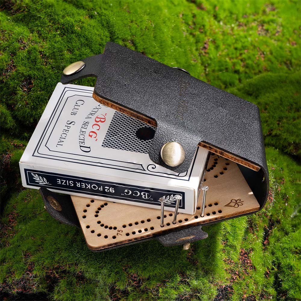 Le plateau de cribbage est niché dans un étui en cuir souple et épais qui permet de ranger vos cartes et votre plateau de manière sûre et compacte. Que vous voyagiez léger, que vous campiez dans la nature ou que vous fassiez la queue pour un brunch, notre plateau de cribbage pratique et durable est facile à garder sur vous pour les moments où vous vous sentez prêt à vous détendre avec une partie.