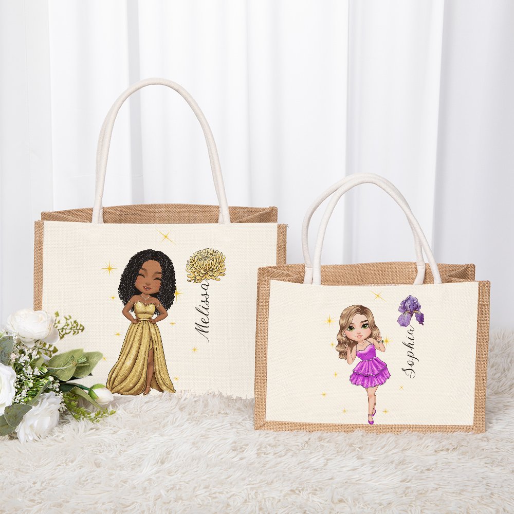 Le devant de ce sac en toile de jute est orné d'un dessin animé représentant une reine du bal de fin d'année, et l'image de la jeune fille scintillante est très délicate et éblouissante. Vous pouvez assortir le personnage de bande dessinée de la tête aux pieds, choisir la fleur correspondant à votre anniversaire et ajouter votre nom pour en faire une pièce unique différente des sacs fourre-tout traditionnels.