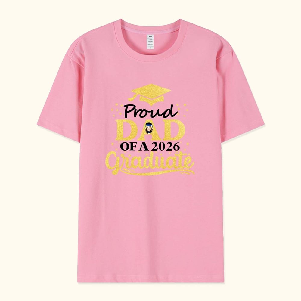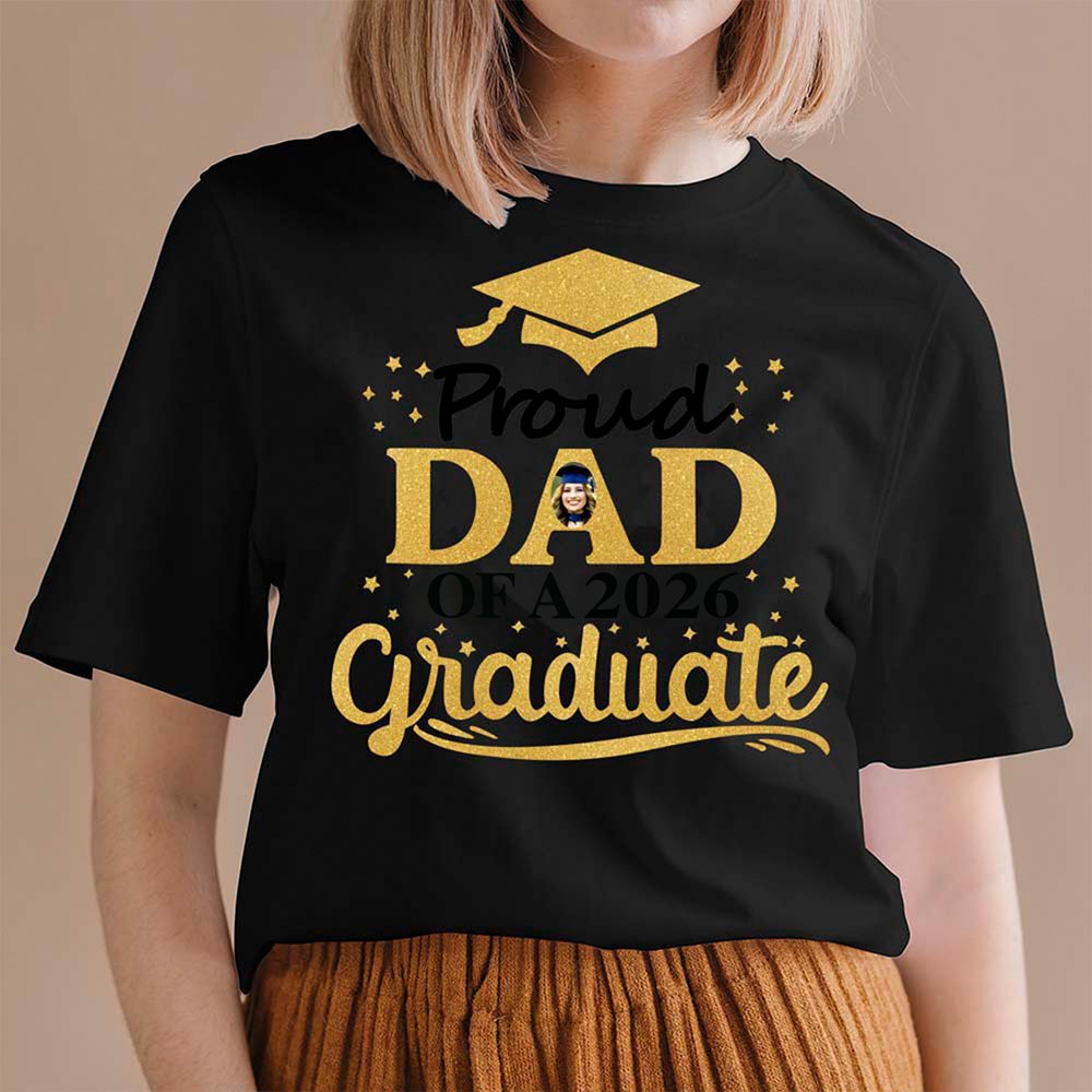 Il présente un motif à paillettes d'or qui affiche fièrement le texte "Proud Mom of A 2026 Graduate". Grâce aux options de personnalisation de la couleur et de la taille du t-shirt, ainsi qu'à la possibilité de télécharger une photo du diplômé, ce t-shirt devient un souvenir personnalisé.