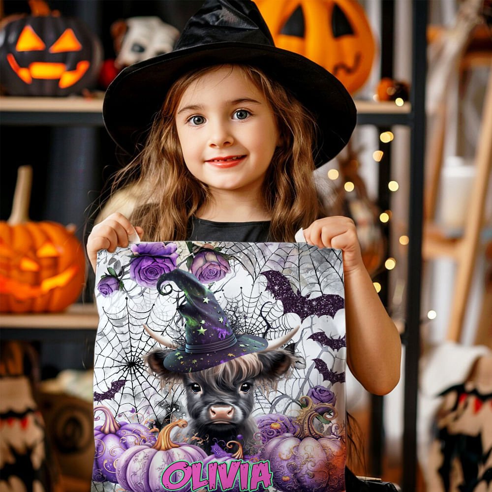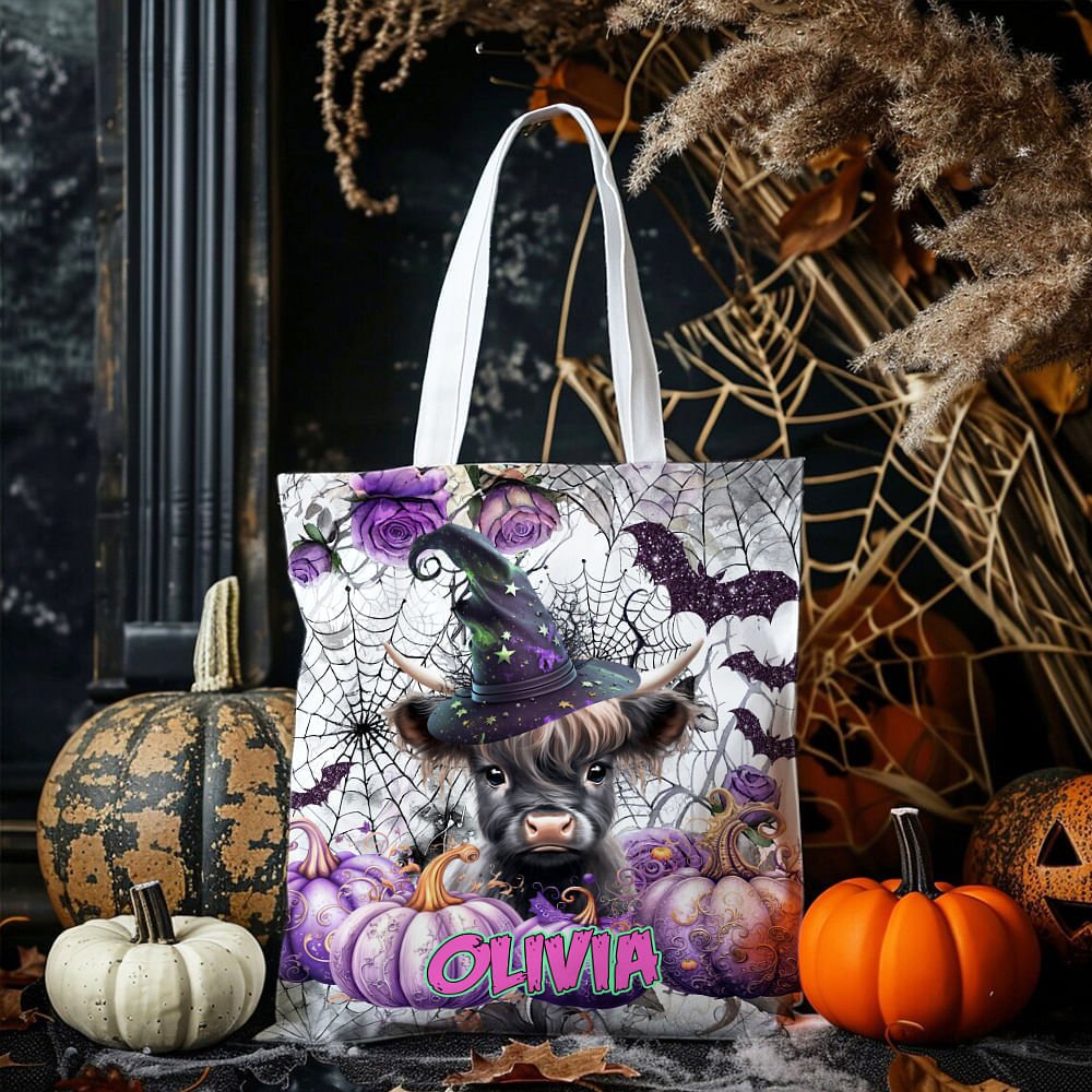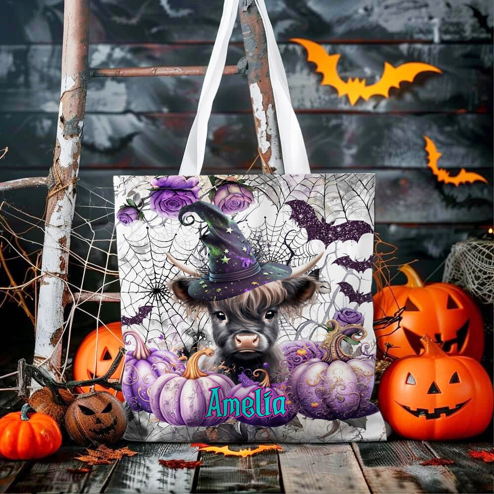 Contrairement à la traditionnelle citrouille dorée, ce sac à main est principalement violet, combinant la vache Highland portant un chapeau de sorcière avec des chauves-souris brillantes, des roses et des citrouilles violettes, et des toiles d'araignée, ajoutant de l'étrangeté et rehaussant la beauté. Il est conçu sur le thème créatif de la vache fantôme des Highlands, parfait pour fêter Halloween !