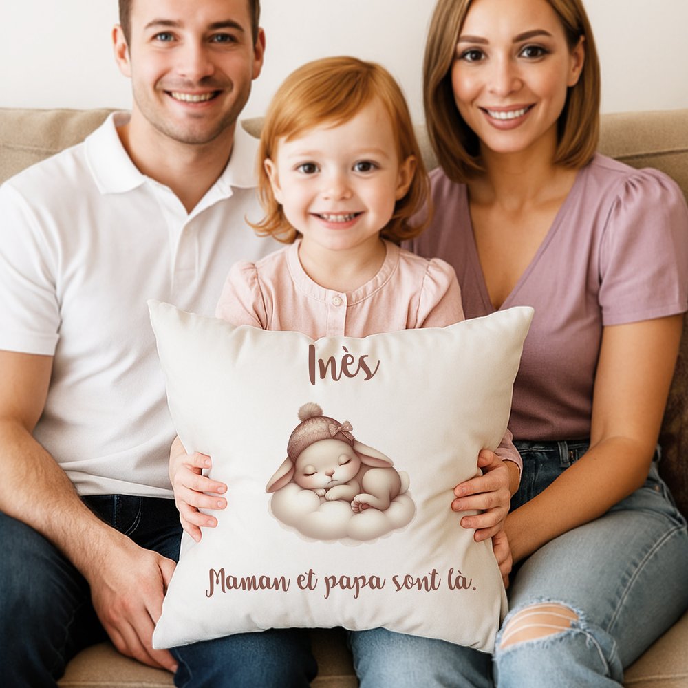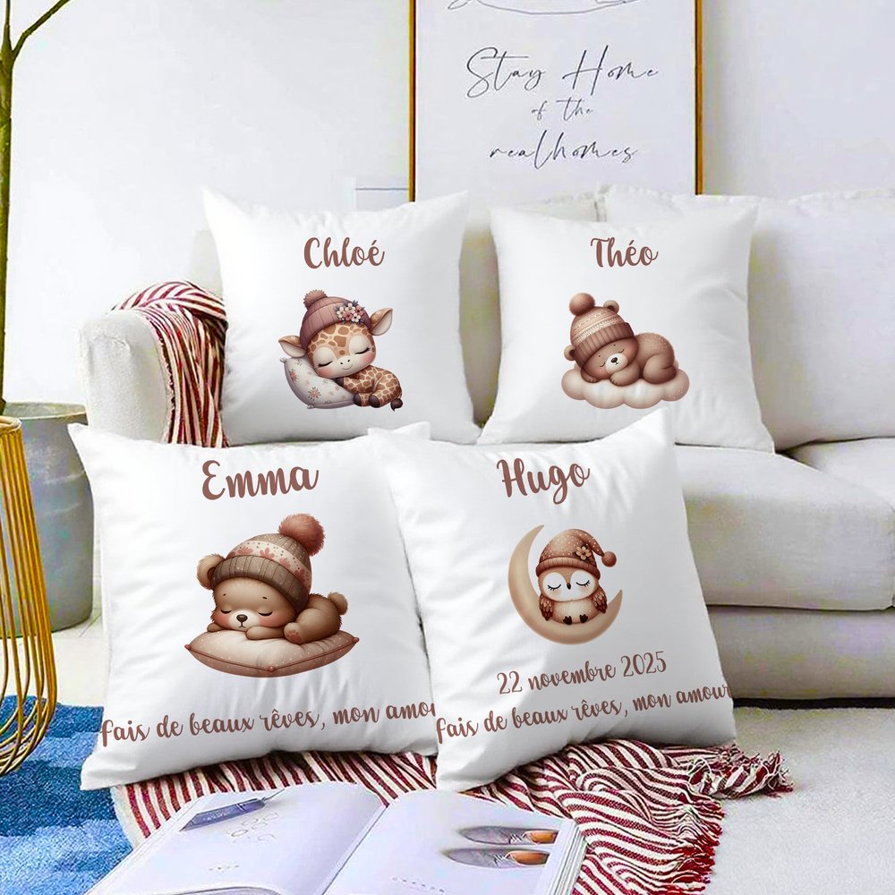 Cette taie d'oreiller est composée de 26 adorables animaux qui aiment dormir, associés à un motif de lune, créant ainsi un style doux et apaisant. Elle peut être personnalisée avec des noms, des dates et des bénédictions, apportant ainsi une touche unique à cet adorable design. L'oreiller est à la fois enfantin et amusant, tout en véhiculant un sentiment unique, créant une atmosphère chaleureuse et confortable dans n'importe quel espace et rehaussant sans effort l'ambiance douillette de la maison.