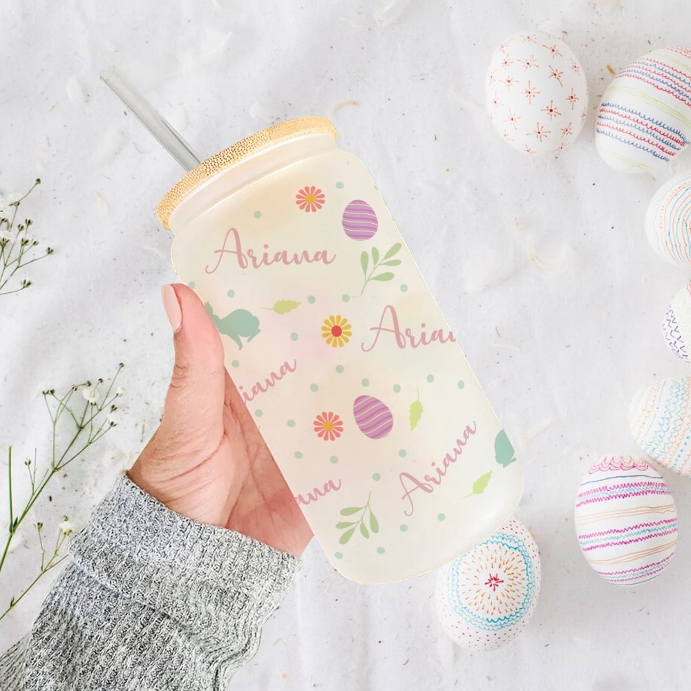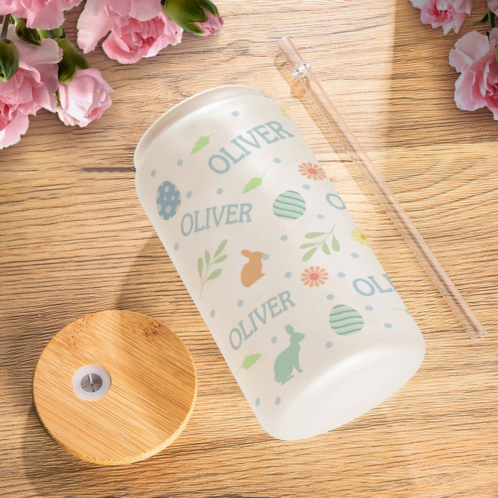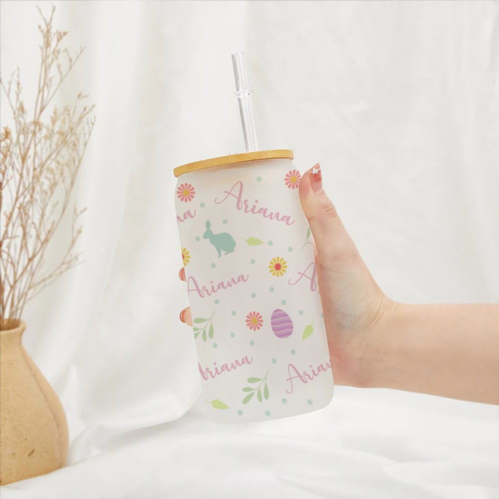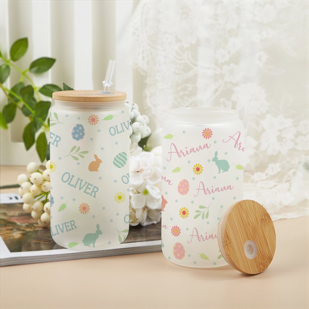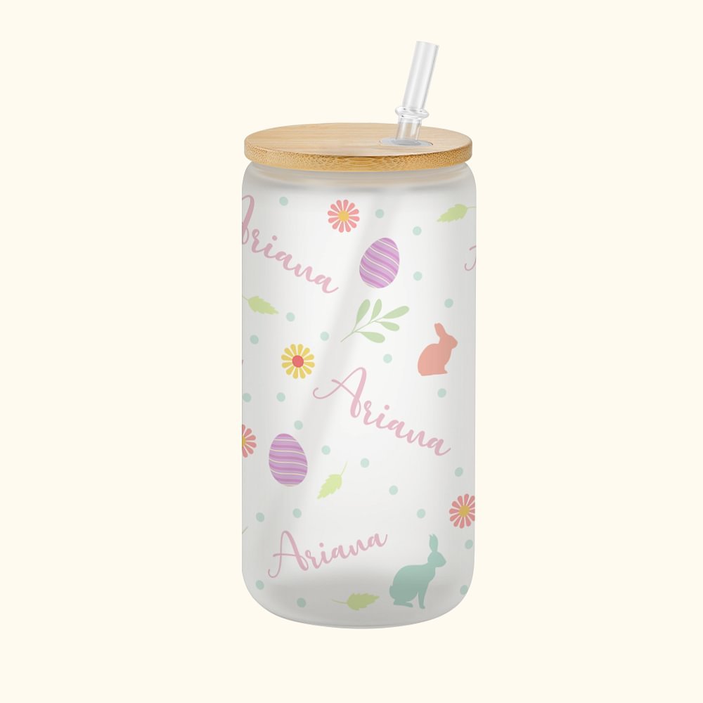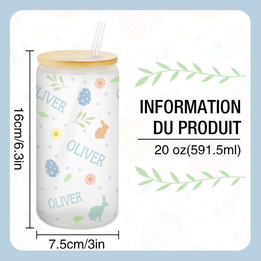 Verre avec Couvercle en Bambou et Paille Motif Pâques Bouteille Personnalisée avec Nom Cadeau Anniversaire Pâques pour Enfants