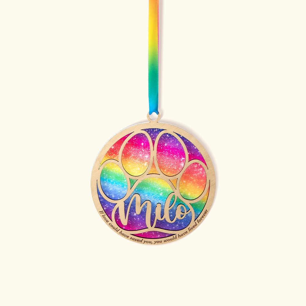 L'avant de l'ornement est fabriqué en bois durable, tandis que l'arrière présente un magnifique morceau d'acrylique coloré qui scintille à la lumière du soleil. Choisissez parmi 12 motifs différents et personnalisez le texte pour créer un souvenir unique et significatif qui rend hommage à votre animal de compagnie bien-aimé.