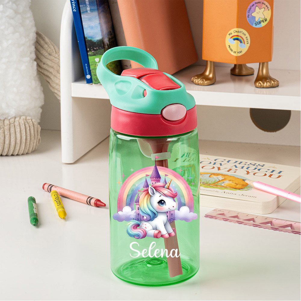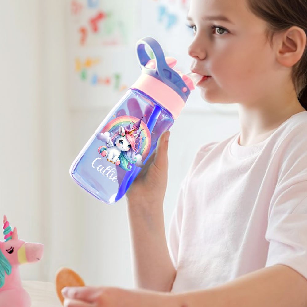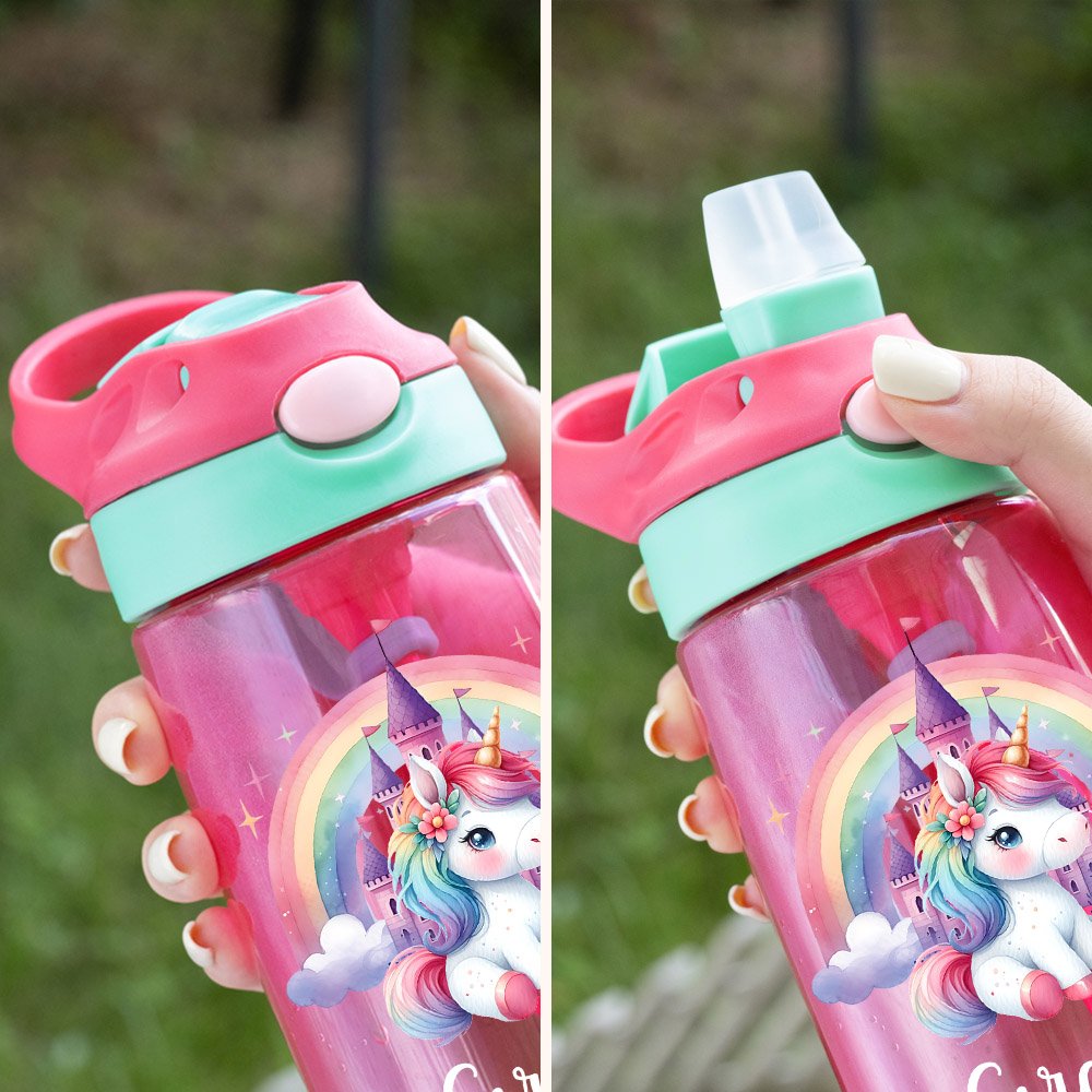 Cette bouteille d'eau a été conçue pour les petites filles et comporte un arc-en-ciel, une licorne fantastique et un nom. Il s'agit d'un accessoire unique et personnel que toutes les filles apprécieront.