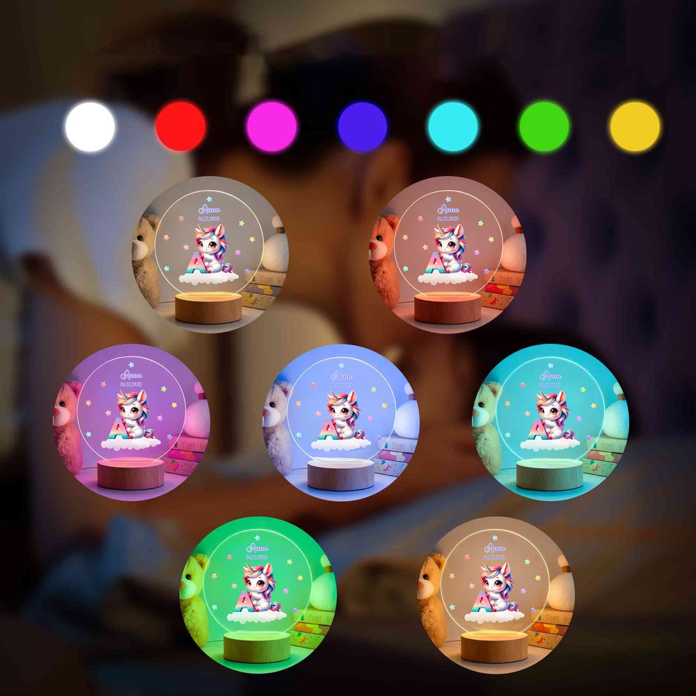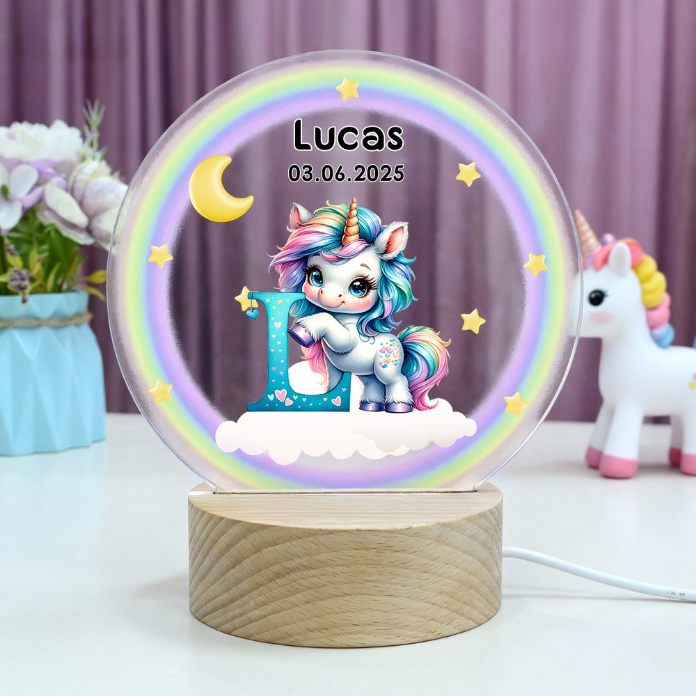 Cette veilleuse associe des images de licornes fantastiques à des éléments personnalisés. Les lumières personnalisables, les motifs d'arrière-plan et l'intégration du nom créent un style qui est à la fois une veilleuse fonctionnelle et une œuvre d'art, idéale pour les enfants qui veulent s'endormir dans un monde de couleurs et d'imagination, tout en se sentant liés à leur propre histoire.