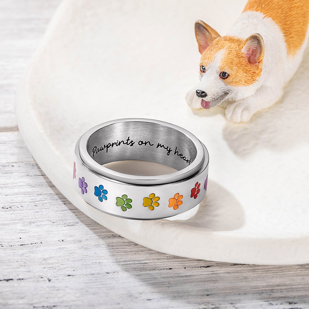 Inspiré par les empreintes de pieds mignons, l'anneau est donné une signification que l'amour pour les animaux de compagnie, s'il vous plaît accepter cette bague comme un témoin de votre histoire avec votre adorable animal de compagnie. Conception unique de l'anneau spinner, toutes les caractéristiques d'une bande intérieure verrouillée dans la bande principale qui peut être filée manuellement, ce qui peut vous aider à surmonter le stress et réduire l'anxiété. Parfait pour quelqu'un qui cherche un moyen non distrayant de rediriger les mauvaises habitudes ou de faire sortir l'énergie agitée.