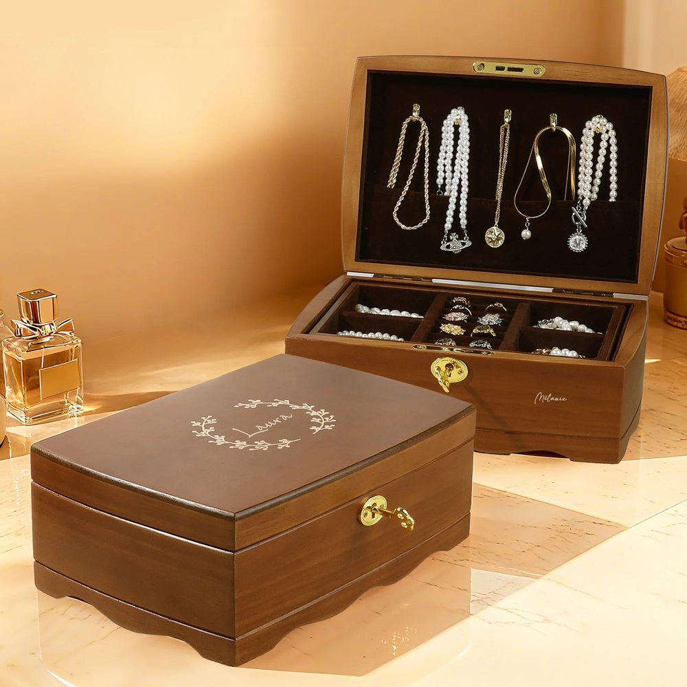 Cette boîte à bijoux offre des détails personnalisables, y compris des noms/initiales et une disposition élégante à une seule couche principale avec deux compartiments cachés. Ces compartiments permettent de séparer les différents colliers, bagues, bracelets ou articles de maquillage, tandis qu'une fermeture à clé ajoute de la sécurité, faisant de cette boîte un organisateur sur mesure qui répond à vos besoins de rangement.