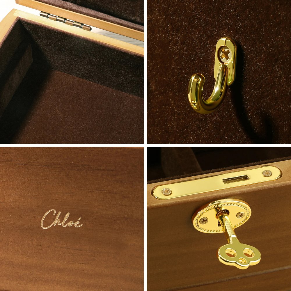 | Soins: | Pour que la finition en bois conserve tout son éclat, évitez de placer la boîte à bijoux à la lumière directe du soleil pendant de longues périodes (cela évite la décoloration) et essuyez rapidement les liquides renversés avec un chiffon doux et sec (les produits nettoyants agressifs peuvent endommager la surface). |