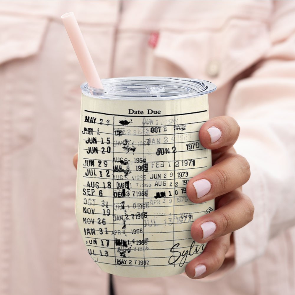 Notre gobelet à vin présente un charmant design rétro de carte d'échéance de bibliothèque qui transportera tous les lecteurs dans leurs aventures littéraires préférées. Le design de la date d'échéance avec un nom personnalisé est une surprise parfaite et inoubliable pour les amoureux des livres.