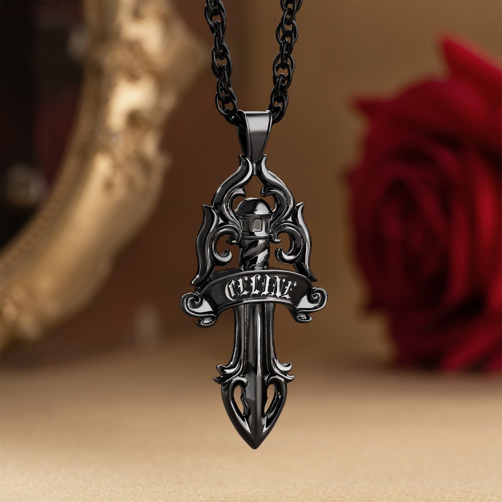 Inspiré des manuscrits médiévaux enluminés, ce modèle est à la fois puissant et romantique. Le mélange de poignards, de fleurs et de volutes ajoute une touche gothique douce, tandis que vous pouvez choisir une version métallique élégante ou un style éblouissant serti de zircons et personnaliser le nom pour plus de personnalité.
