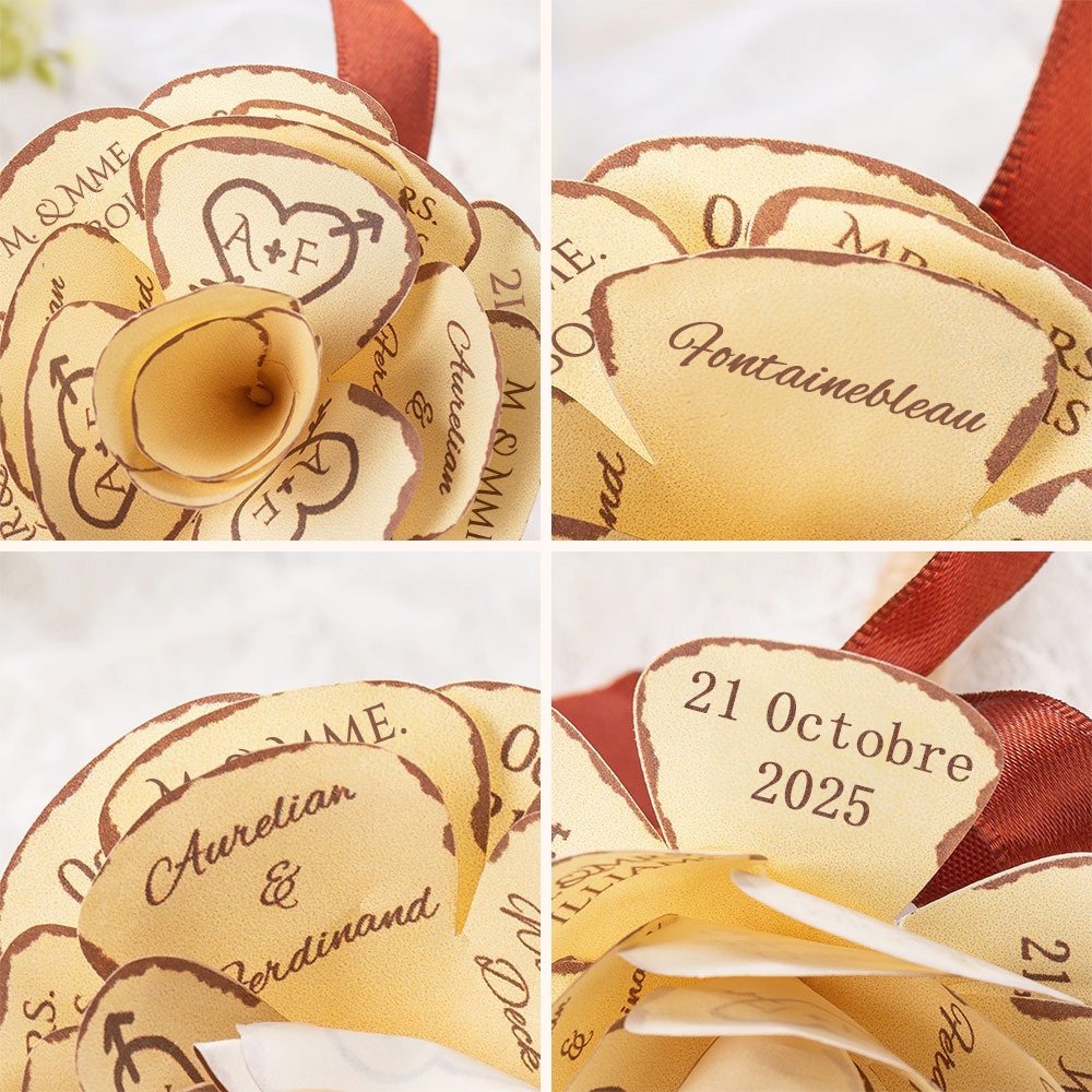 L'option de personnalisation vous permet d'ajouter les initiales du couple, son prénom, son nom, le lieu du mariage et la date aux pétales, ce qui en fait une pièce mémorable qui reflète l'histoire d'amour unique du couple.