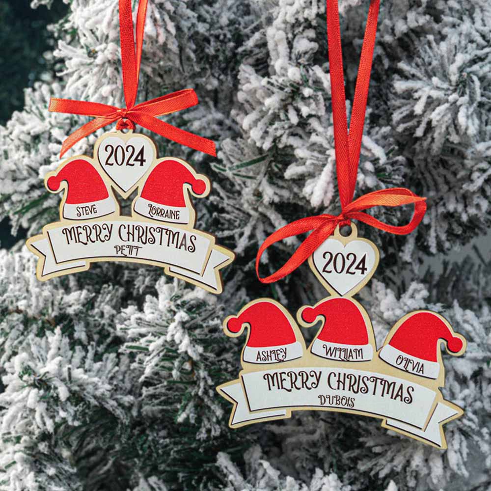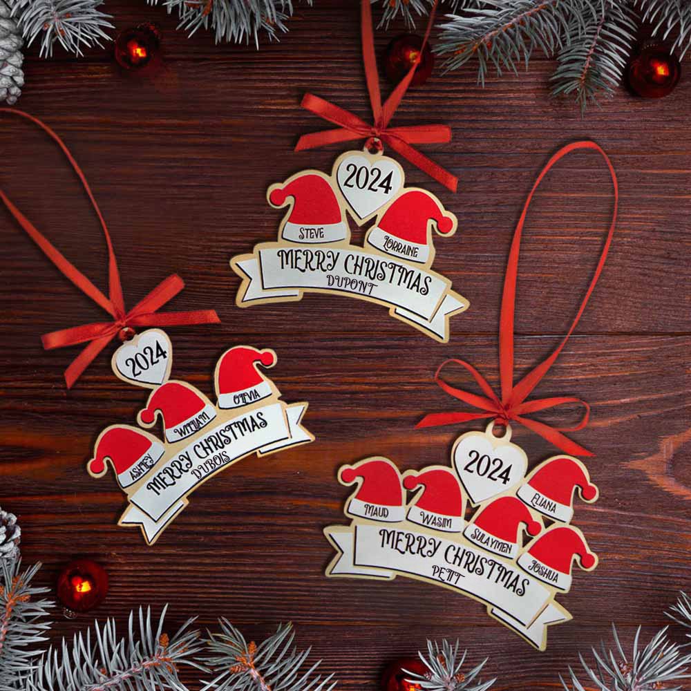 Notre ornement personnalisé est à la fois délicat et festif, ce qui en fait un bel ajout à tout arbre de Noël. Les noms de chaque membre de la famille sont inscrits sur les chapeaux, ce qui ajoute une touche personnelle à votre décor de Noël. La phrase sur la bannière et l'année sur le cœur suspendu en font un souvenir unique et spécial.