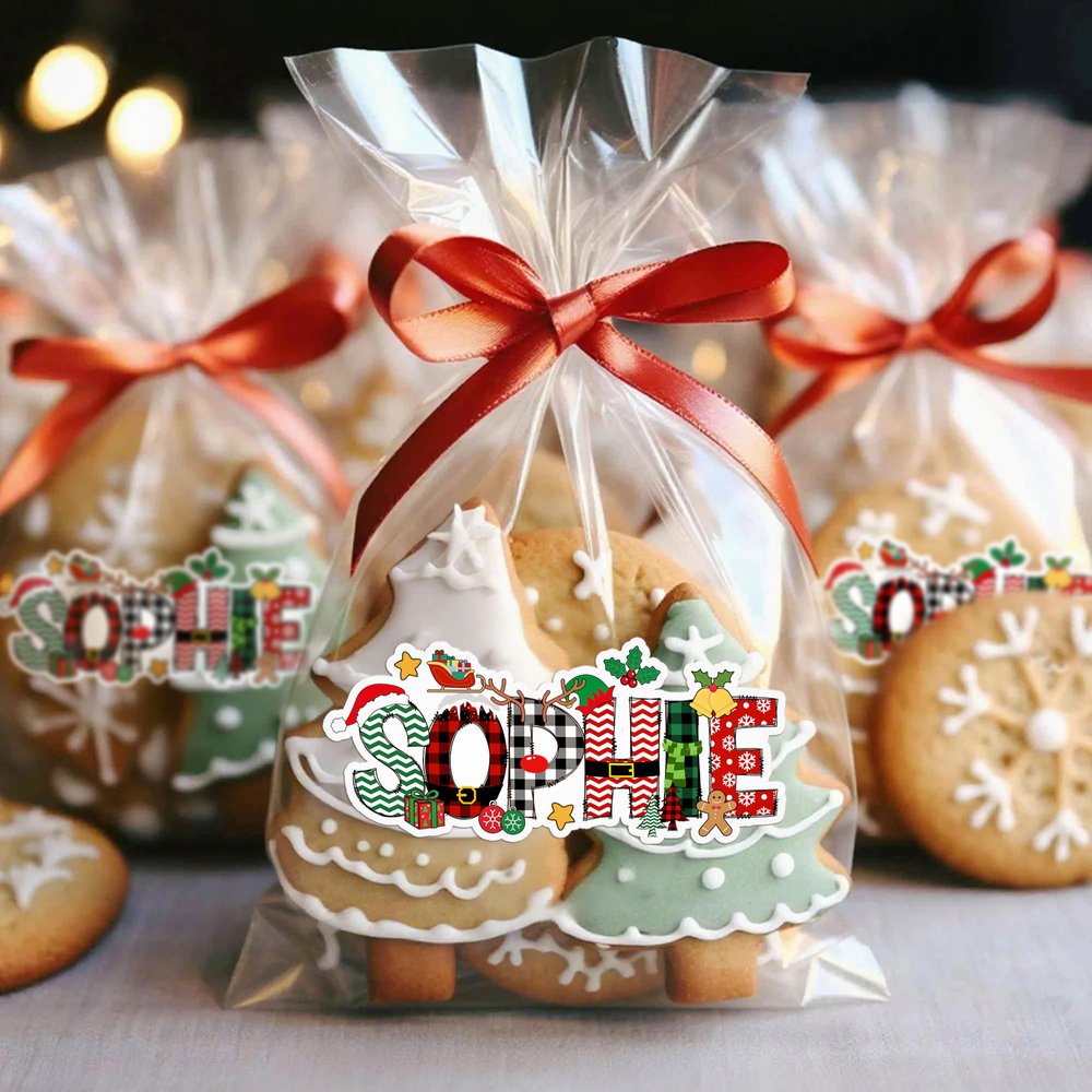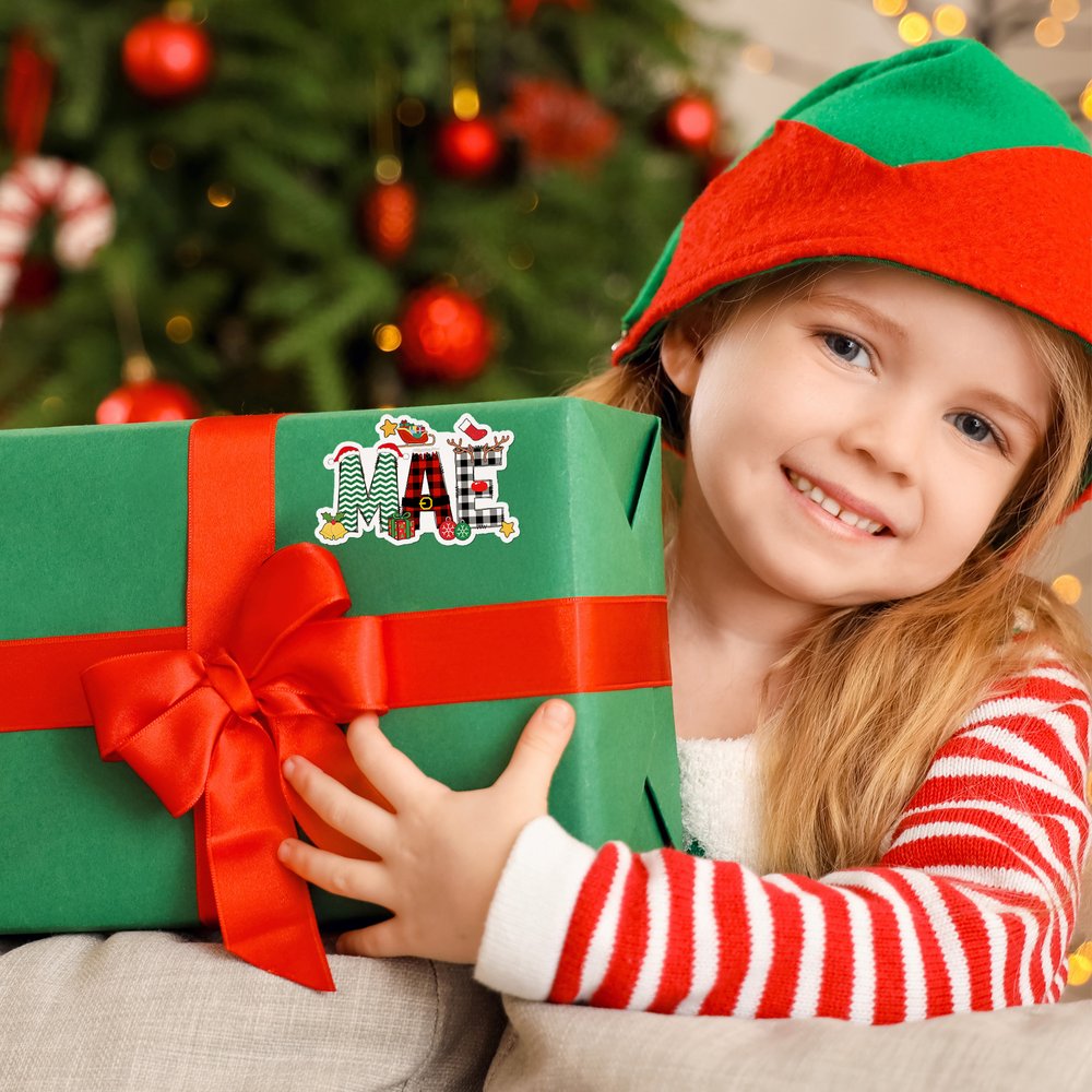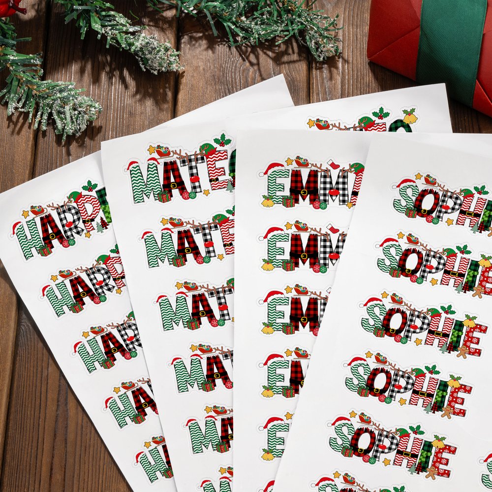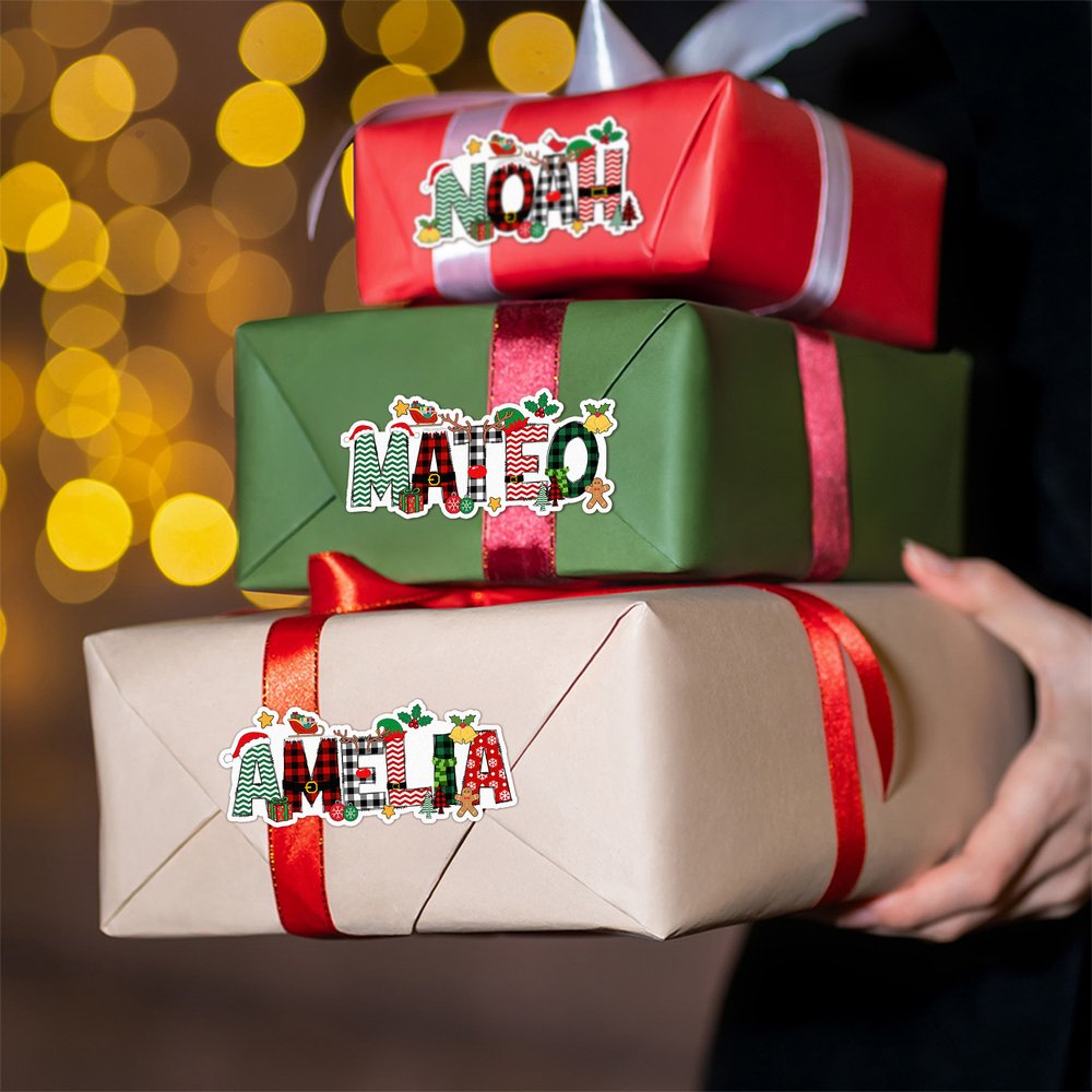 Ces autocollants présentent un thème de lettres de Noël et un design cartoonesque. Des détails tels que des carreaux rouges et noirs, des boutons dorés, des chapeaux de Père Noël et des rennes, associés à des noms personnalisés, créent une riche atmosphère de Noël, rendant chaque autocollant unique et significatif, ce qui en fait un autocollant amusant et festif.