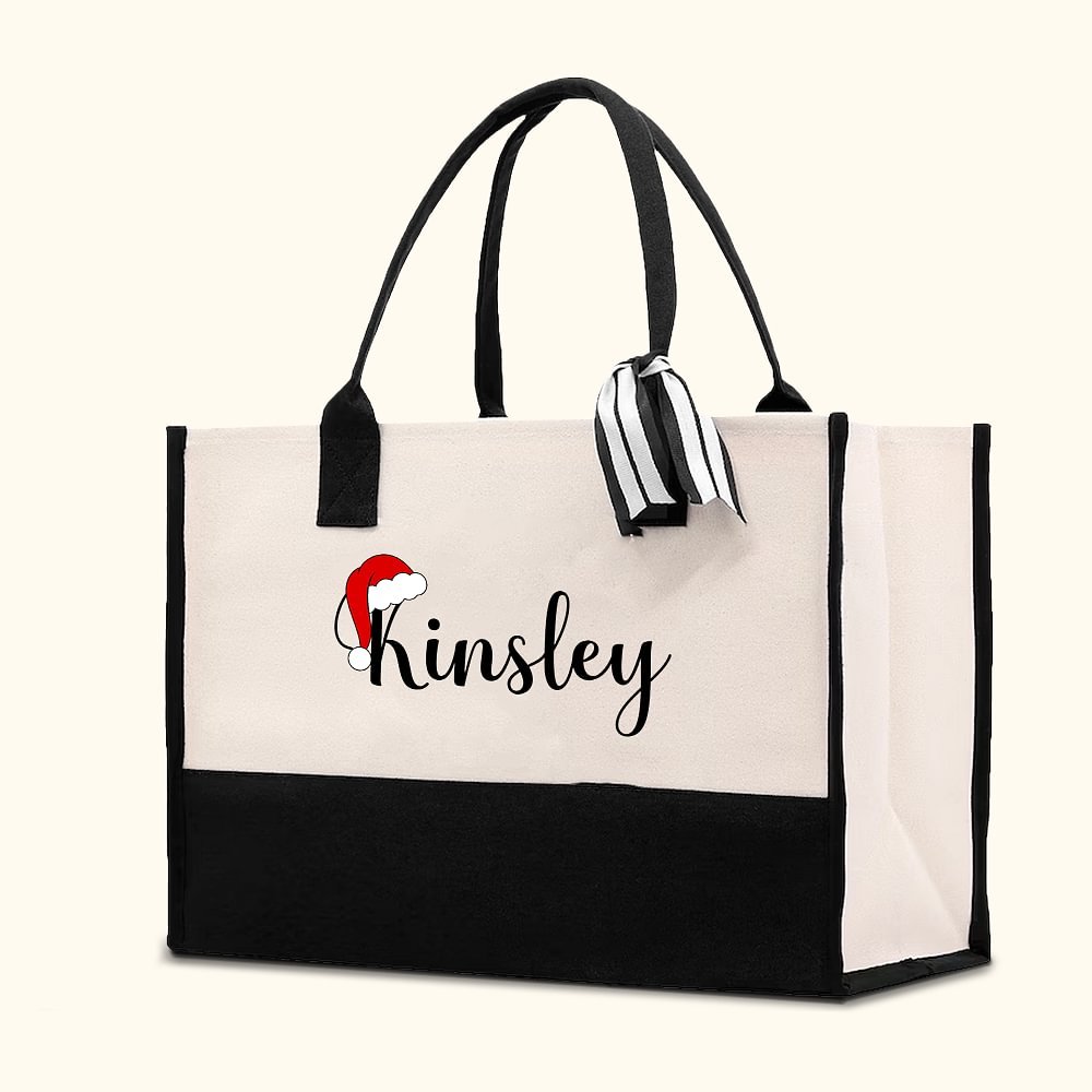 Ce sac fourre-tout présente une charmante combinaison de bonnet de Père Noël et d'options de noms personnalisables. Ce sac fourre-tout vous permet de le personnaliser en écrivant votre nom ou celui d'un être cher. Il est disponible en quatre couleurs vibrantes qui capturent l'esprit festif tout en offrant un design ludique et charmant parfait pour Noël.