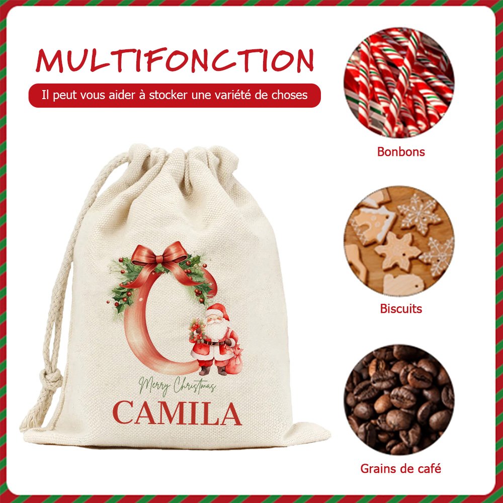 Avec son ravissant motif de Père Noël orné de feuilles de houx, de jolis nœuds et d'adorables clochettes, ce sac Merry Christmas ajoute une touche festive à vos célébrations de Noël. Personnalisez-le avec des initiales et des noms pour créer un sac à friandises unique qui se distinguera lors des fêtes de Noël.
