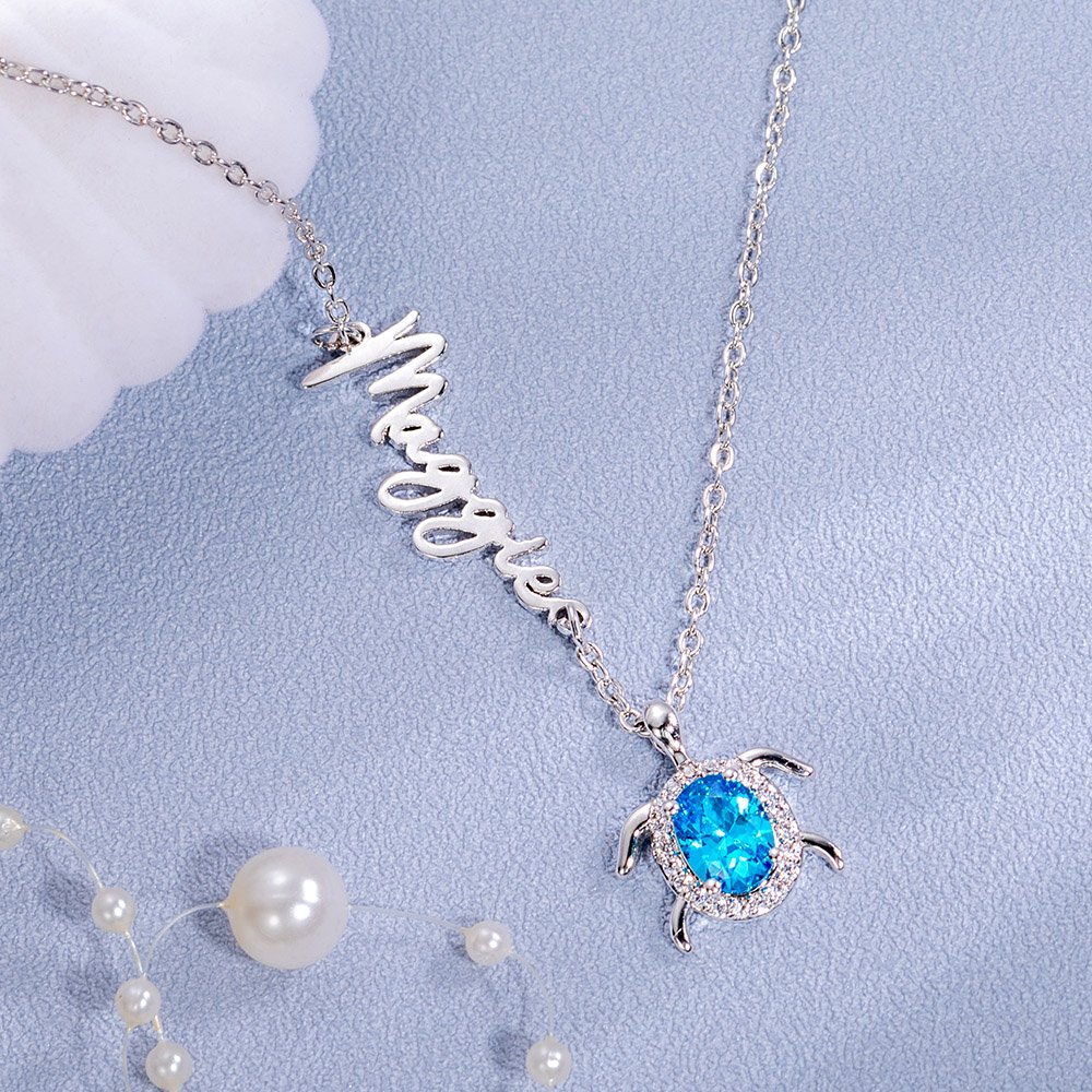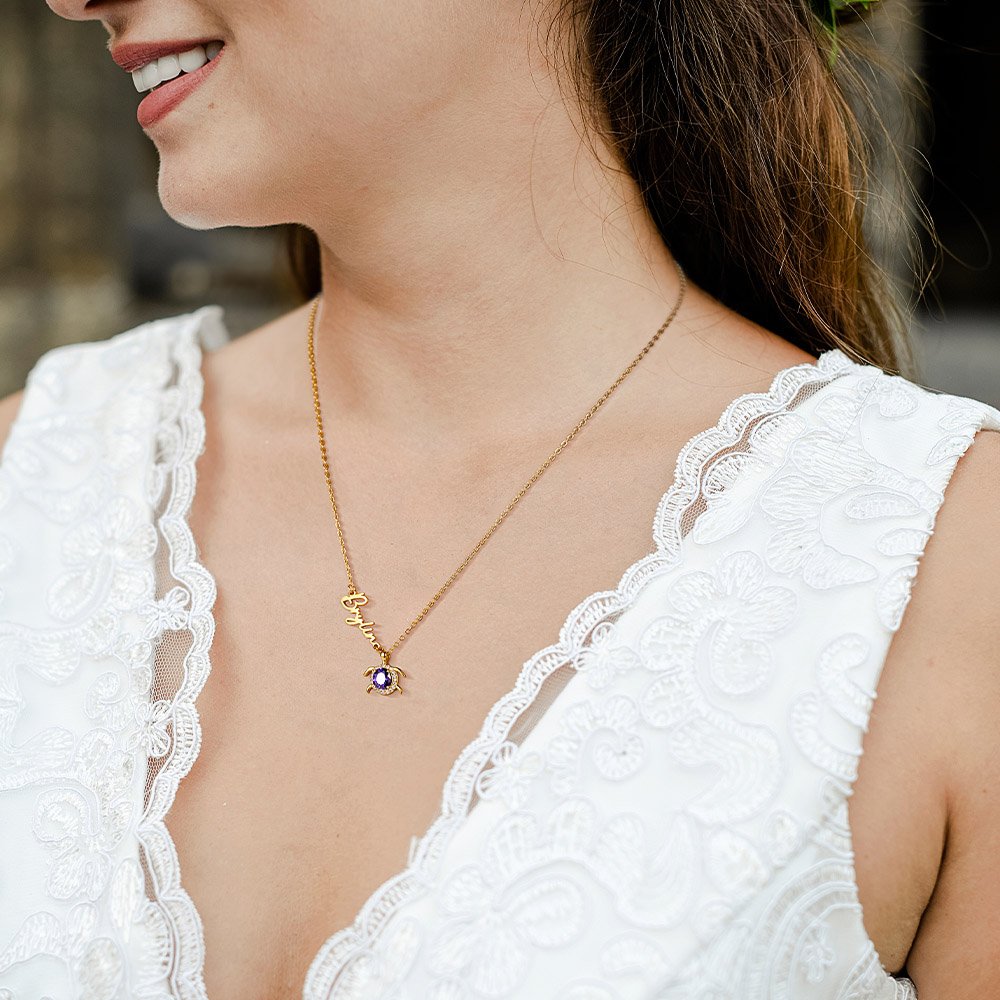 Vous êtes à la recherche d'un cadeau unique ? Ce charmant collier avec une tortue comme pierre de naissance ne manquera pas de vous séduire. Le pendentif est une image très mignonne d'une tortue. La pierre de naissance est sertie au milieu de la tortue et est entourée d'un cercle de pierres fines.