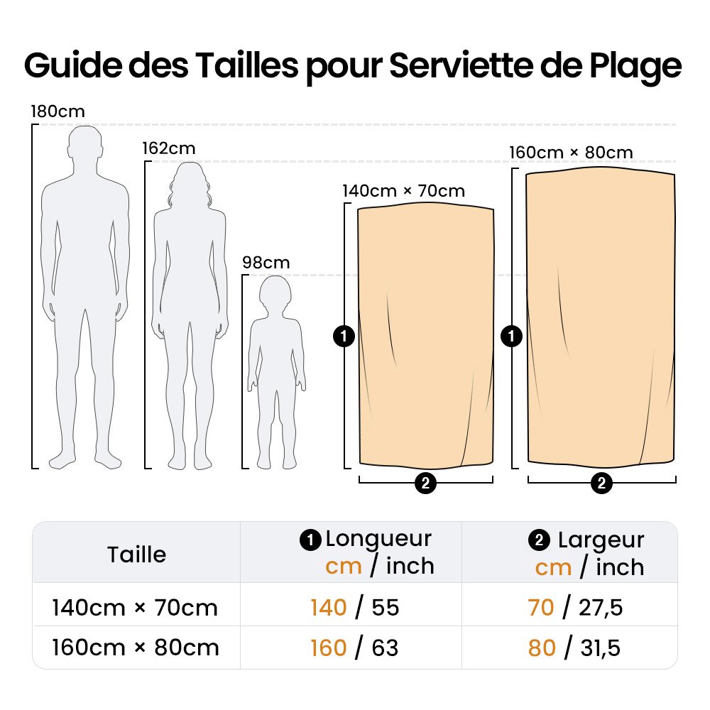 Cette serviette de plage est fabriquée en microfibre de haute qualité, qui est douce au toucher et aussi douce pour les peaux sensibles. Elle a une excellente absorption de l'eau, une capacité de séchage rapide et un design sans sable, qui vous permet de vous débarrasser facilement du sable. De plus, cette serviette est légère et portable, parfaite pour vos aventures à la plage.
