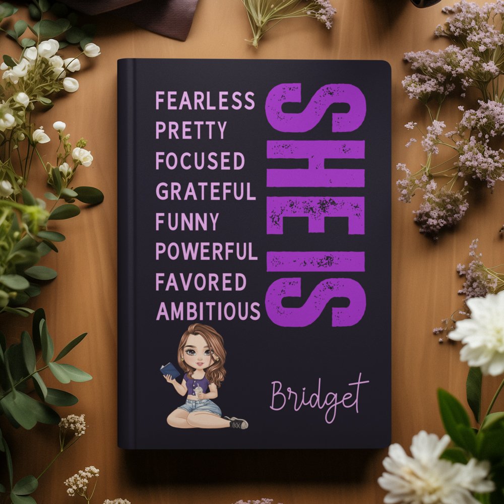 La couverture comprend également une liste de mots d'affirmation valorisants tels que "Sans peur", "Jolie", "Concentrée", "Reconnaissante", "Drôle", "Puissante", "Favorisée" et "Ambitieuse". Ces mots servent de rappel quotidien des attributs positifs et peuvent renforcer l'estime de soi de la personne qui utilise le carnet. Ils ajoutent un aspect motivant et inspirant au dessin.