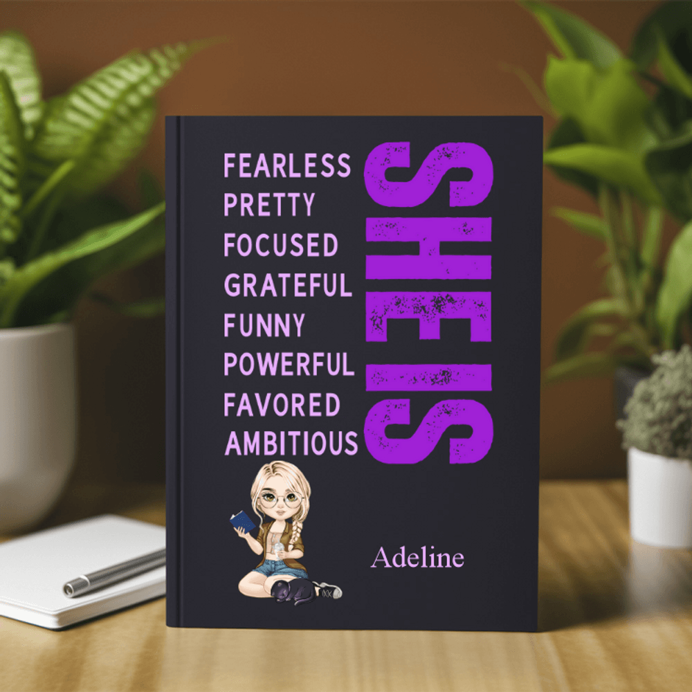 Le carnet présente une illustration charmante et unique d'une jeune fille de bande dessinée occupée à lire. Cette illustration est visuellement attrayante et évoque un sentiment de calme et de curiosité intellectuelle. La jeune fille est représentée dans une pose détendue, assise et tenant un livre, ce qui en fait un personnage attachant sur la couverture. Le nom personnalisé est indiqué sur la couverture, ce qui en fait un objet véritablement individualisé. Cette touche personnelle fait de ce carnet un cadeau unique et significatif, montrant qu'il a été créé pour son destinataire.