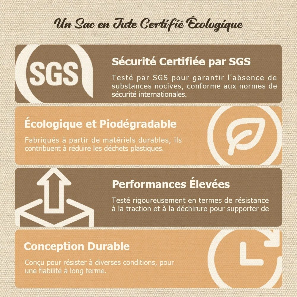 Fabriqué en jute de haute qualité et respectueux de l'environnement, ce sac fourre-tout est à la fois robuste et élégant. Le tissu est suffisamment résistant pour transporter tous vos articles de fête, tandis que les coutures soignées et les poignées renforcées lui permettent de supporter sans problème des cadeaux lourds.