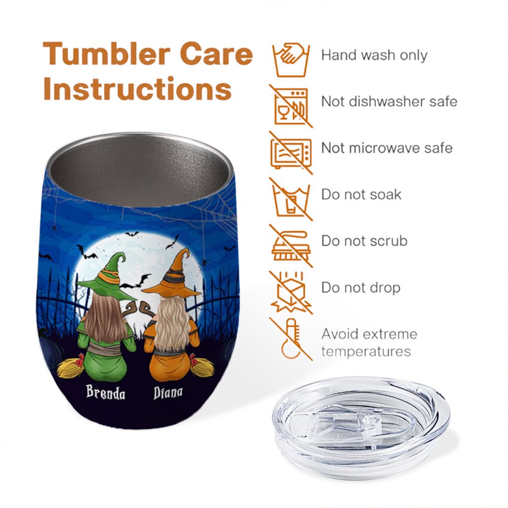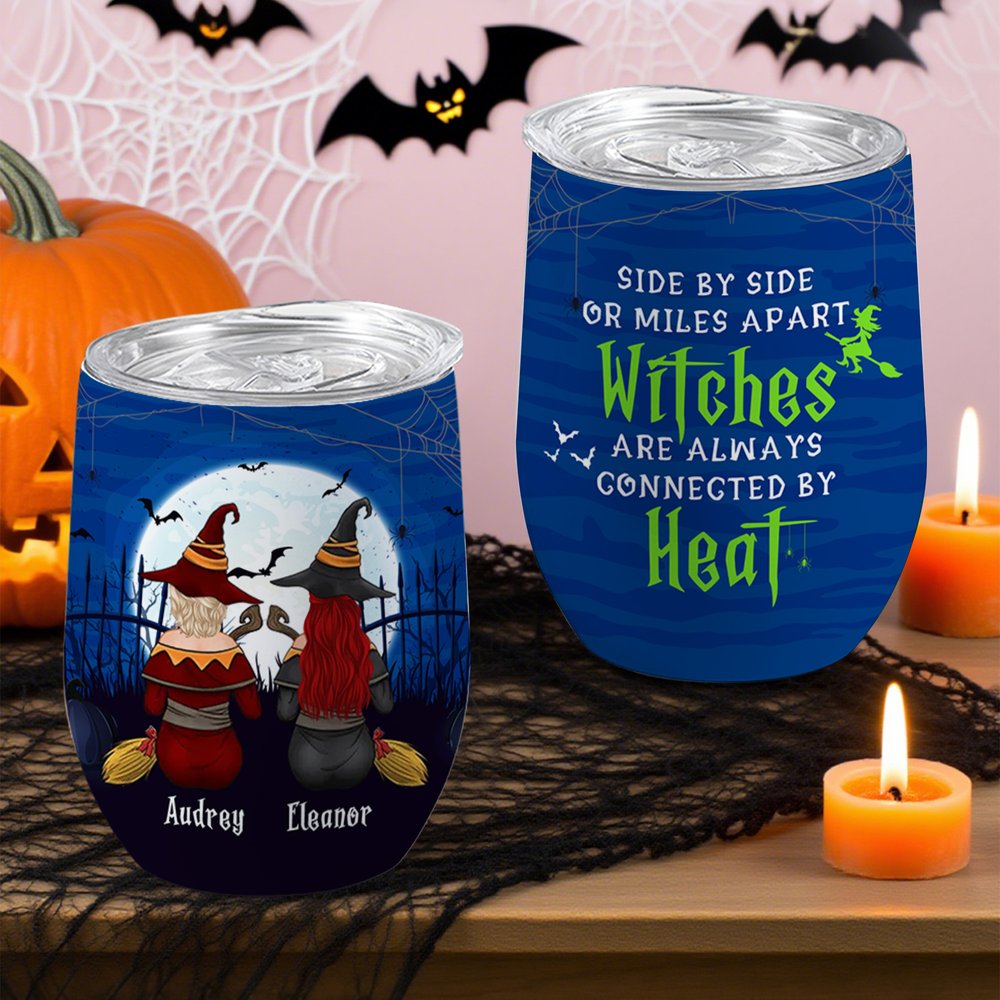 Verre à vin isotherme 12 oz personnalisé Side by Side ou Miles Apart Cartoon Witches avec noms Cadeau d'Halloween pour Sisters Besties