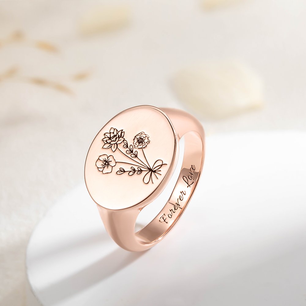 Cette chevalière personnalisée avec fleur de naissance est un bijou vraiment exquis conçu spécialement pour les femmes. Son design élégant et sa touche personnalisée en font l'accessoire parfait pour ajouter de la beauté et de l'émotion à n'importe quelle tenue.
