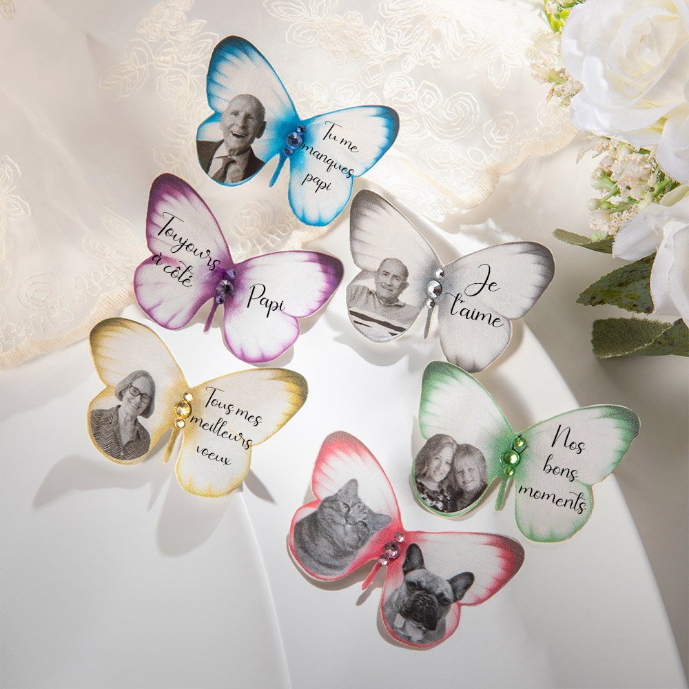 Cette broche en forme de papillon est fabriquée en soie douce. Elle est personnalisable, vous pouvez télécharger n'importe quelle photo et remplir n'importe quel texte pour en faire une broche unique.